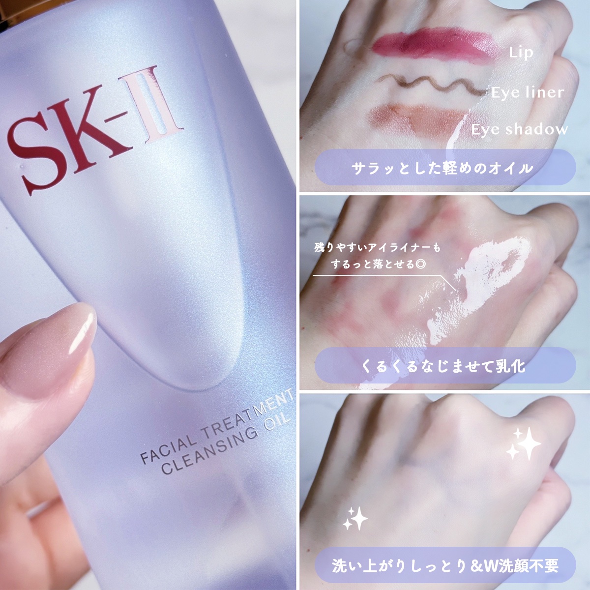 - フェイシャル トリートメント クレンジング オイルはメークの汚れや毛穴の汚れ、日焼け止めもすっきりと落とし、マスカラなどのポイントメークまでしっかり取り除きます。肌表面を弱酸性に保ち、やさしくクレンジング。特に混合肌やオイリー肌タイプの方におすすめです。 ●使用成分について SK-II ピテラ™と保湿成分を配合し、クリアな素肌へ導きます。 ・ピテラ™* 特別な酵母の発酵過程で生み出され、肌の中に本来存在する天然保湿因子(NMF)のいくつかを含みます。また、ビタミン類、ミネラル類、アミノ酸類など50種類を超える有用成分を含み、肌本来の働きを整えます。 ・リンゴ種子エキス ビタミン豊富で、肌をみずみずしく整えます。 ・ワサビノキ種子エキス(整肌成分) 北インド原産のモリンガ(ワサビノキ)の種子から抽出した成分。モリンガ種子は優れたクレンジング作用があることで知られています。 ●得られる効果 輝くツヤ/キメの整った肌 ●お手入れ方法 ステップ 1:手や顔をぬらさずに使用します。ポンプ3~5押しを乾いた手のひらに取ります。 ステップ 2:顔全体へ、指の腹ですべらせるように素早くのばします。小鼻など毛穴の汚れが目立つ部分は指先でクルクルとマッサージするようになじませます。 ステップ 3: その後、水またはぬるま湯で洗い流します。 ●使用するタイミング 朝夜2 回/日