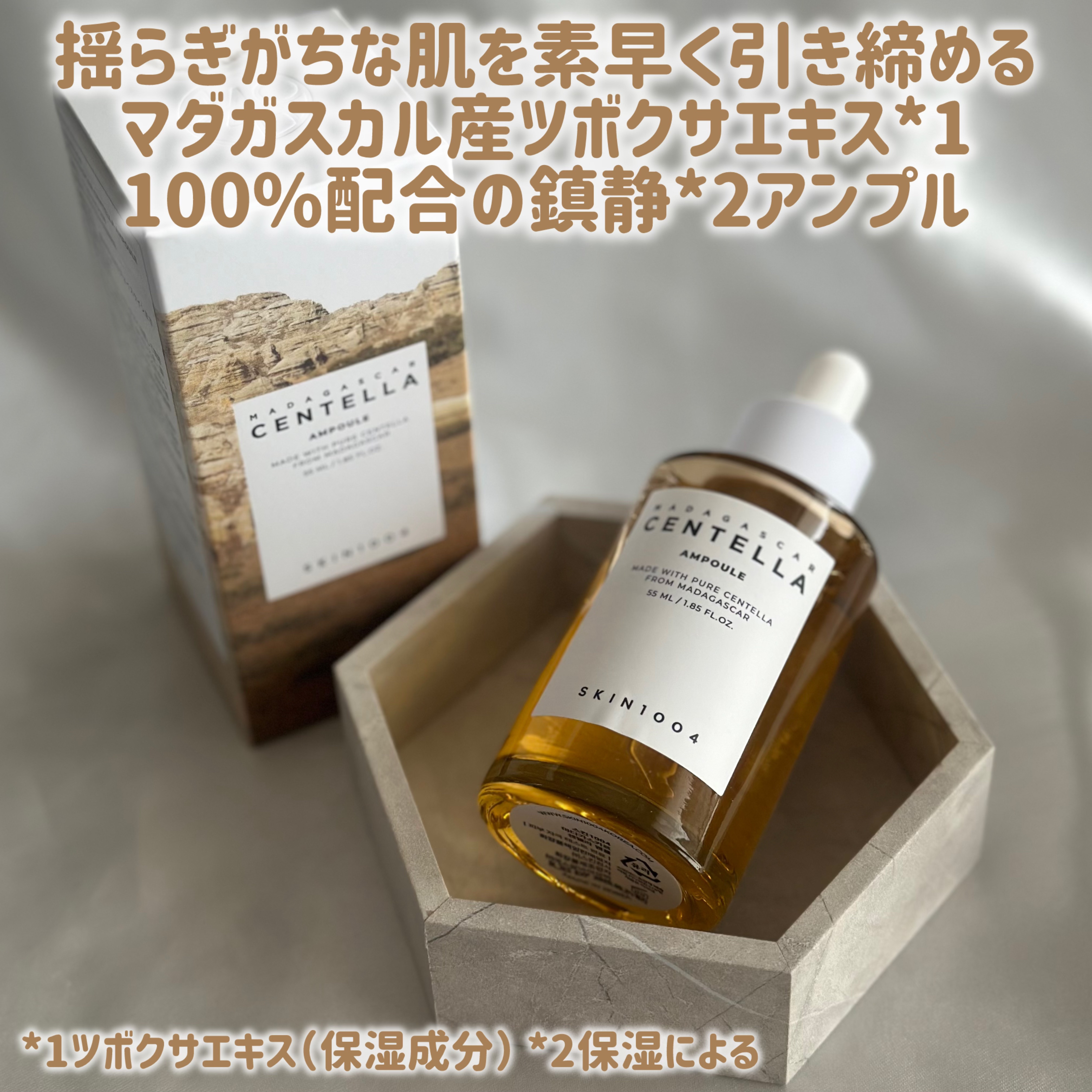 - 太古の自然マダガスカルの自然由来ツボクサエキス*1を100%配合し、乾燥により刺激を受けた肌を整える美容液です。敏感に傾いた肌を素早く整える*2と同時に、乾燥による外部の刺激によって荒れやすい肌をしっとり艶やかに導きます。ベタつかないサラっとしたテクスチャーで、潤いをたっぷりと。 *1ツボクサエキス(保湿成分) *2パッチテスト済み(すべての方に刺激が起きないわけではありません)