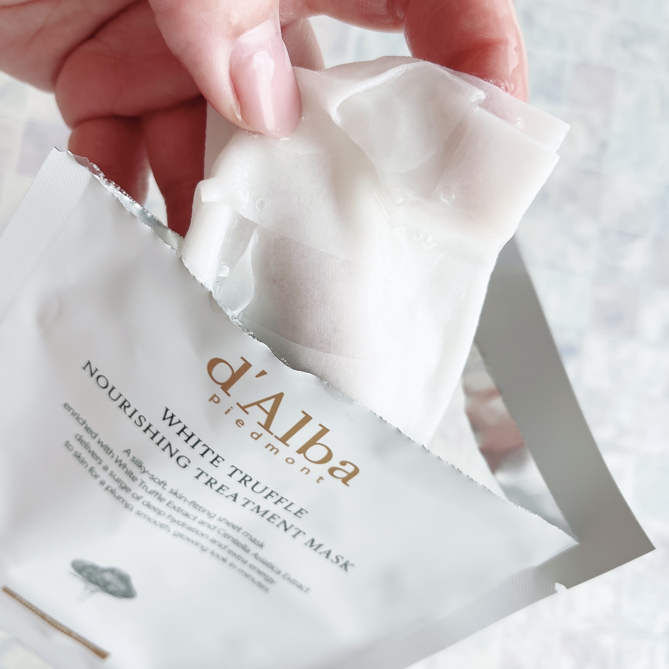 イタリア産ホワイトトリュフとコラーゲンエキスを贅沢に含む濃縮セラムが特長。手に出したときに、「湯葉?」と思ったほど、濃厚でずしりとした厚みと重み。 しっかりと切り込みが入ったシートなので、顔全体にのせてから、耳の前方にひっぱりあげることで、引き締まり、リフティング効果にもなりそうで、こちら、かなりおすすめです。 肌に優しく密着してくれるヴィーガン認証取得のシートを使用。顔の凹凸にも細かくフィットし、ずれずにしっかりと密着してくれるので、はじめて、「ダルバ」のマスクパックを使う人はこちらから使うとよさそう。