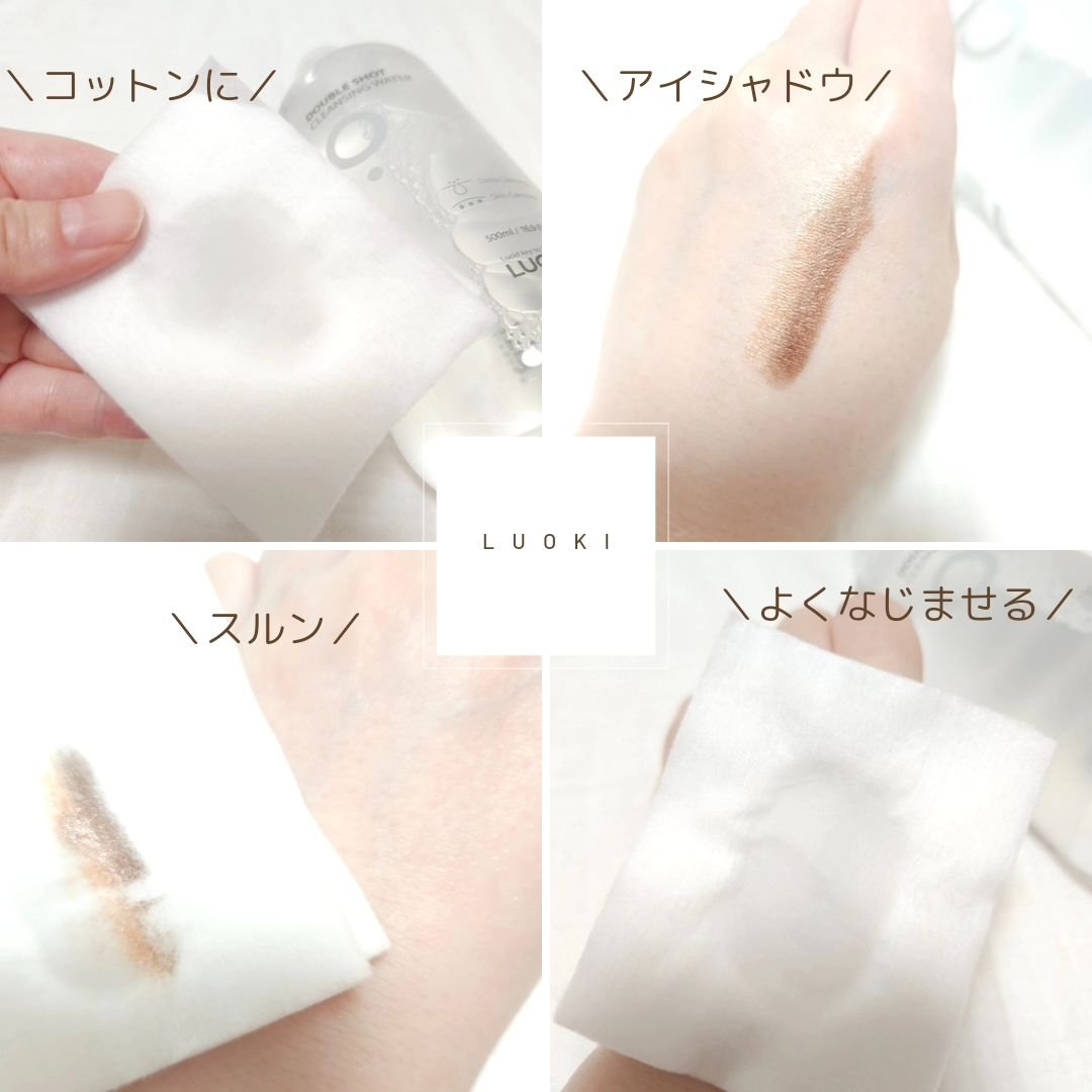 LUOKIダブルショットクレンジングウォーターを使いました。界面活性クレンジング成分と自然由来ディープクレンジング成分が一緒になっているそうです。ベタインとアラントインが洗浄後の乾燥とつっぱりを抑えて、肌にしっとりと滑らかさを与えてくれるそう...