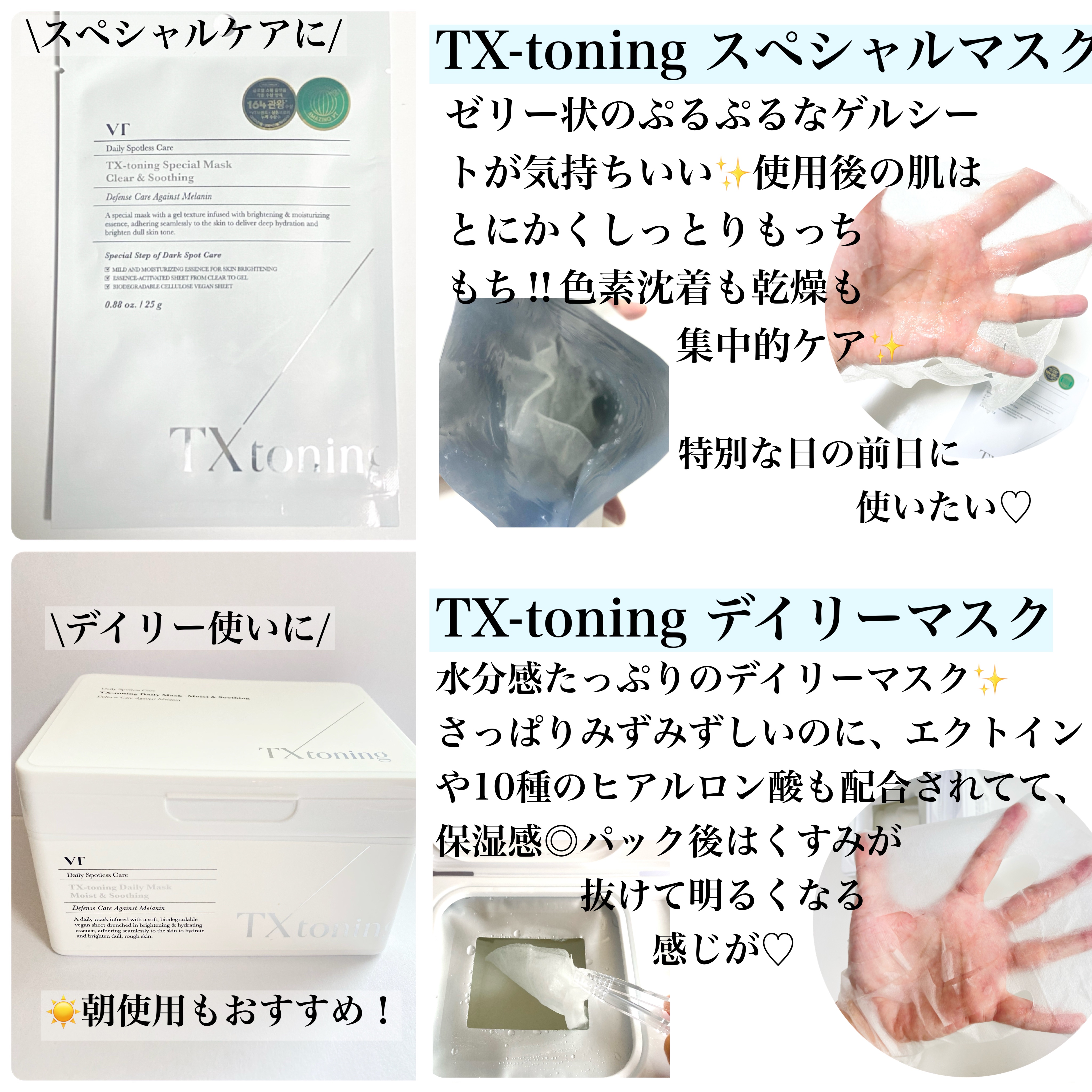 高純度トラネキサム酸を配合で肌のくすみや、色素沈着にアプローチ! すっぴん美肌へ導くラインです✨ みずみずしいゆるめのクリーム♡ しっとりするのにベタつかないのでメイク前でも使いやすいです◎ 柔らかいぷるぷるしっとりマスク とろみのある美容液たっぷりで使用後すぐはベタつきが残りますが馴染ませるとしっとり🥰