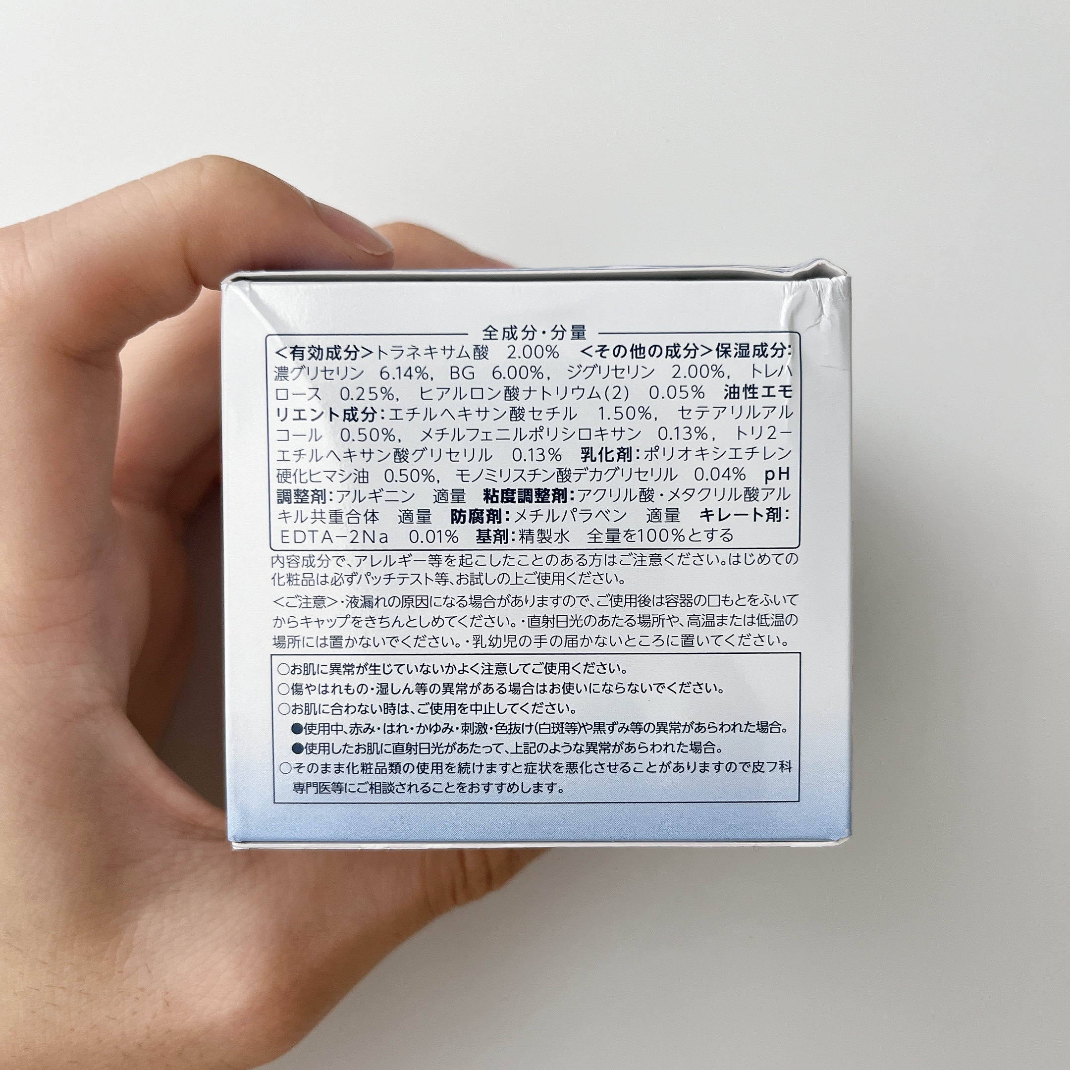 - <有効成分>トラネキサム酸 2.00% <その他の成分>保湿成分:濃グリセリン 6.14%, BG 6.00%, ジグリセリン 2.00%, トレハロース 0.25%, ヒアルロン酸ナトリウム(2) 0.05% 油性エモリエント成分:エチルヘキサン酸セチル 1.50%, セテアリルアルコール 0.50%, メチルフェニルポリシロキサン 0.13%, トリ2-エチルヘキサン酸グリセリル 0.13% 乳化剤:ポリオキシエチレン硬化ヒマシ油 0.50%, モノミリスチン酸デカグリセリル 0.04% pH調整剤:アルギニン 適量 粘度調整剤:アクリル酸・メタクリル酸アルキル共重合体 適量 防腐剤:メチルパラベン 適量 キレート剤:EDTA-2Na 0.01% 基剤:精製水 全量を100%とする