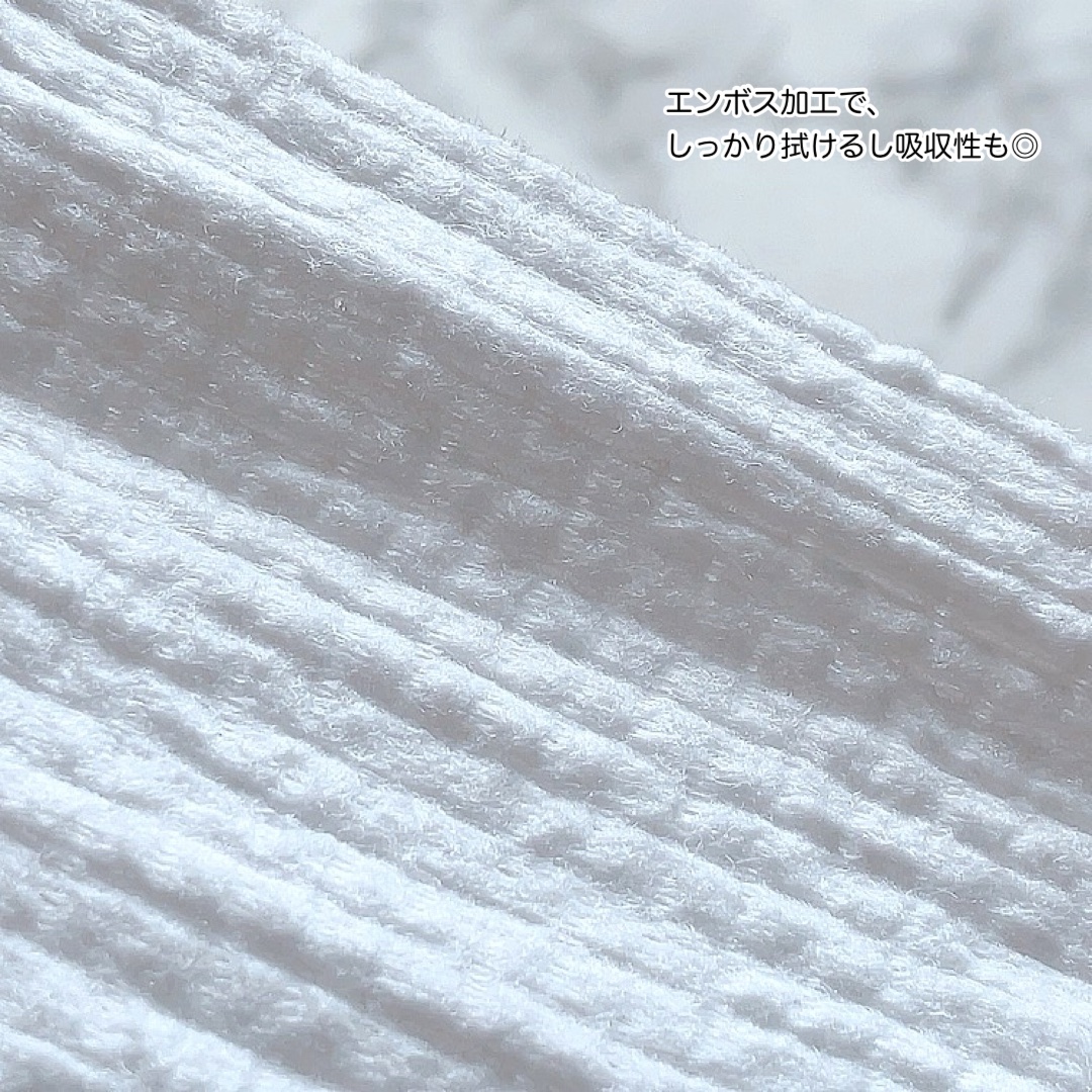 辛口雑誌のLDKのベストバイに選ばれたり、モンドセレクションにも選ばれているすごい商品✨ 私もよく店頭で見かけて気になってた! 柔らかい素材で、小紋ざめ模様のエンボス加工になっていて、汚れも落ちやすくなっているの🥰 蛍光漂白剤不使用だから赤ちゃんにも安心して使える😆 洗濯の手間もなくいつでも清潔だからこれいいよ😍