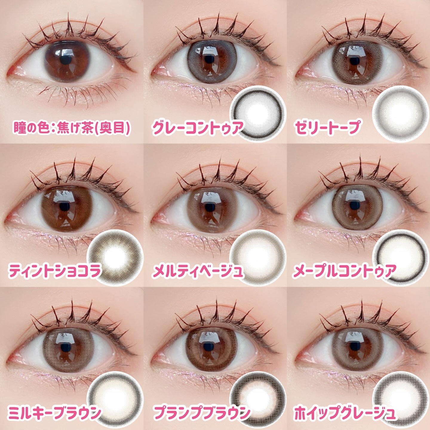キャンマジ新色出たよ💕 馴染む立体感がヨジャドルっぽくて新色の中で1番よく使ってるカラー。 どんなメイクとも相性がいいので使いやすいです! 着色直径よりも体感大きめに感じるのも🙆🏻♀️ オレンジ感の少ないブラウンだから口紅やチーク次第で幼くも大人っぽくもなれる。 浮かない太めフチで可愛いさ溢れてます✨ レンズ単体だとめちゃくちゃピンクなのかなと思ったけど着けたら馴染みました💕 パキッとしないのでほわほわしたピンクが好きな人やラメメイクが好きな人にもおすすめ◎