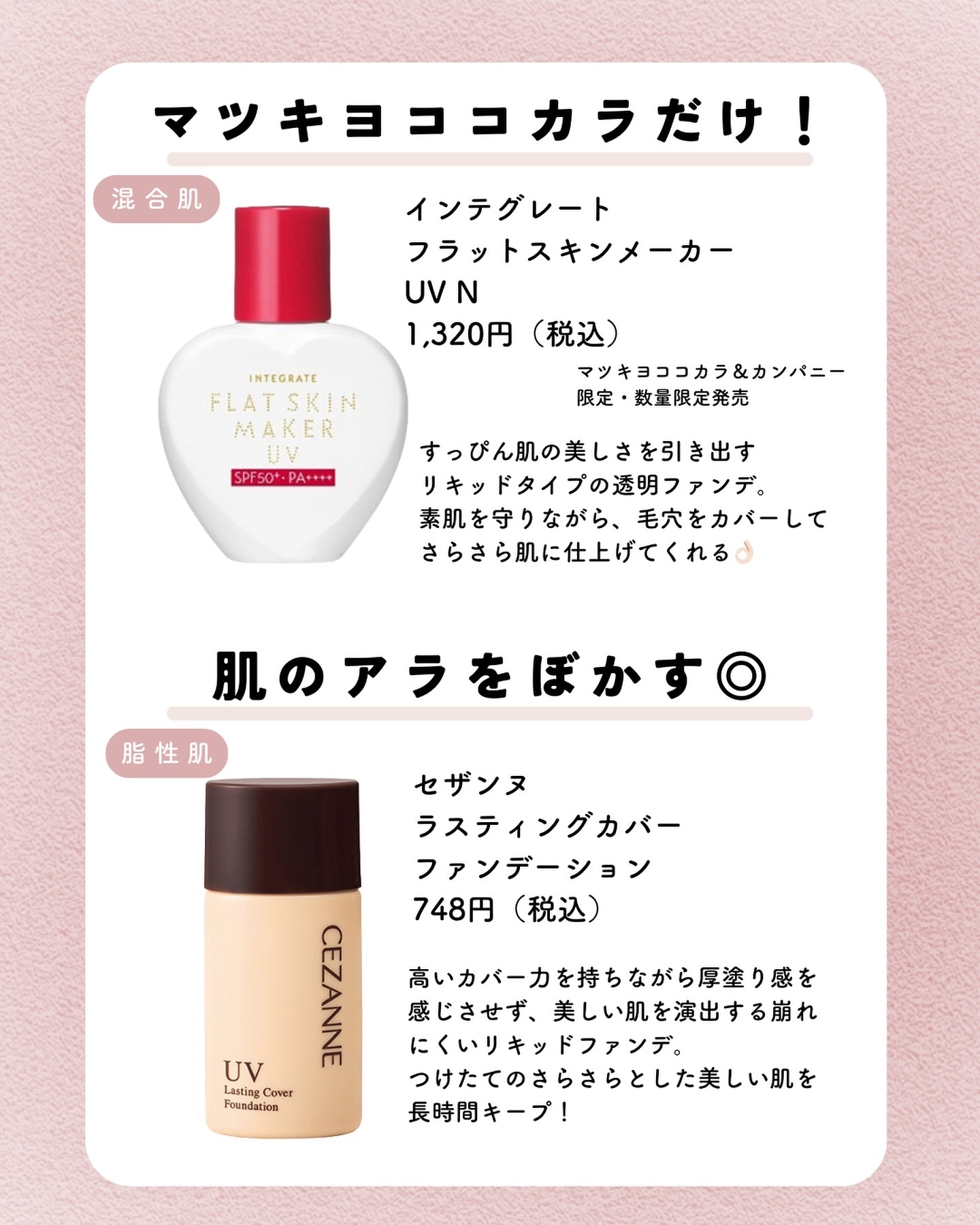 肌質別に相性のいいアイテムをまとめてみたよ★ ぜひチェックしてね😊✨ #マジョリカマジョルカ ミルキーラッピング ファンデ 1,540円(税込) #メイベリン ニューヨーク フィットミー リキッド ファンデーション R 1,859円(税込)