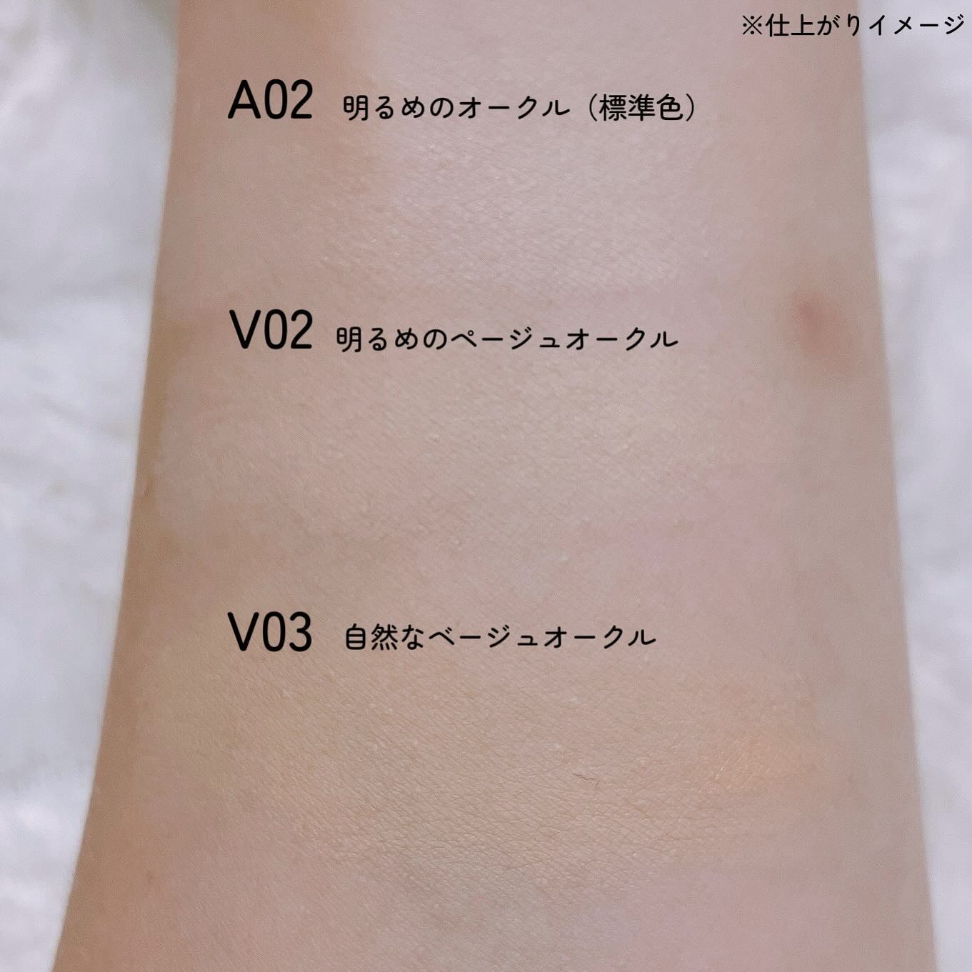 - <A02 明るいオークル(標準色)> 水、酸化チタン、メチルトリメチコン、シクロペンタシロキサン、メトキシケイヒ酸エチルヘキシル、カプリリルメチコン、PEG-10ジメチコン、プロパンジオール、フェニルベンズイミダゾールスルホン酸、トリメチルシロキシケイ酸、ポリメタクリル酸メチル、シクロヘキサシロキサン、ナイアシンアミド、合成フルオロフロゴパイト、トロメタミン、ナイロン-12、酸化鉄、1,2-ヘキサンジオール、ラウリルPEG-9ポリジメチルシロキシエチルジメチコン、ジステアルジモニウムヘクトライト、パンテノール、塩化Na、ステアリン酸亜鉛、水酸化Al、ニンフェアケルレア花水、ポリプロピルシルセスキオキサン、ステアリン酸、(アクリレーツ/アクリル酸エチルヘキシル/メタクリル酸ジメチコン)コポリマー、ジステアリルジモニウムクロリド、パルミトイルプロリン、(アクリレーツ/ジメチコン)コポリマー、パルミチン酸、香料、パルミトイルグルタミン酸Mg、パルミトイルサルコシンNa、ミリスチン酸Al、アデノシン、トリエトキシカプリリルシラン、スクワラン、トコフェロール、クレアチン、尿素、フルクトース、グルコース、アラニン、トレオニン、グリシン、グルタミン、ヒスチジン、グルタミン酸、塩化Ca、アスパラギン、塩化Mg、ウシ血清アルブミン <V02 明るいベージュオークル> 水、酸化チタン、メチルトリメチコン、シクロペンタシロキサン、メトキシケイヒ酸エチルヘキシル、カプリリルメチコン、PEG-10ジメチコン、プロパンジオール、フェニルベンズイミダゾールスルホン酸、トリメチルシロキシケイ酸、ポリメタクリル酸メチル、シクロヘキサシロキサン、ナイアシンアミド、合成フルオロフロゴパイト、トロメタミン、ナイロン-12、酸化鉄、1,2-ヘキサンジオール、ラウリルPEG-9ポリジメチルシロキシエチルジメチコン、ジステアルジモニウムヘクトライト、パンテノール、塩化Na、ステアリン酸亜鉛、水酸化Al、ニンフェアケルレア花水、ポリプロピルシルセスキオキサン、ステアリン酸、(アクリレーツ/アクリル酸エチルヘキシル/メタクリル酸ジメチコン)コポリマー、ジステアリルジモニウムクロリド、パルミトイルプロリン、(アクリレーツ/ジメチコン)コポリマー、パルミチン酸、香料、パルミトイルグルタミン酸Mg、パルミトイルサルコシンNa、ミリスチン酸Al、アデノシン、トリエトキシカプリリルシラン、スクワラン、トコフェロール、クレアチン、尿素、フルクトース、グルコース、アラニン、トレオニン、グリシン、グルタミン、ヒスチジン、グルタミン酸、塩化Ca、アスパラギン、塩化Mg、ウシ血清アルブミン <V03 自然なベージュオークル> 水、酸化チタン、メチルトリメチコン、シクロペンタシロキサン、メトキシケイヒ酸エチルヘキシル、カプリリルメチコン、PEG-10ジメチコン、プロパンジオール、フェニルベンズイミダゾールスルホン酸、トリメチルシロキシケイ酸、ポリメタクリル酸メチル、シクロヘキサシロキサン、ナイアシンアミド、合成フルオロフロゴパイト、トロメタミン、ナイロン-12、酸化鉄、1,2-ヘキサンジオール、ラウリルPEG-9ポリジメチルシロキシエチルジメチコン、ジステアルジモニウムヘクトライト、パンテノール、塩化Na、ステアリン酸亜鉛、水酸化Al、ニンフェアケルレア花水、ポリプロピルシルセスキオキサン、ステアリン酸、(アクリレーツ/アクリル酸エチルヘキシル/メタクリル酸ジメチコン)コポリマー、ジステアリルジモニウムクロリド、パルミトイルプロリン、(アクリレーツ/ジメチコン)コポリマー、パルミチン酸、香料、パルミトイルグルタミン酸Mg、パルミトイルサルコシンNa、ミリスチン酸Al、アデノシン、トリエトキシカプリリルシラン、スクワラン、トコフェロール、クレアチン、尿素、フルクトース、グルコース、アラニン、トレオニン、グリシン、グルタミン、ヒスチジン、グルタミン酸、塩化Ca、アスパラギン、塩化Mg、ウシ血清アルブミン