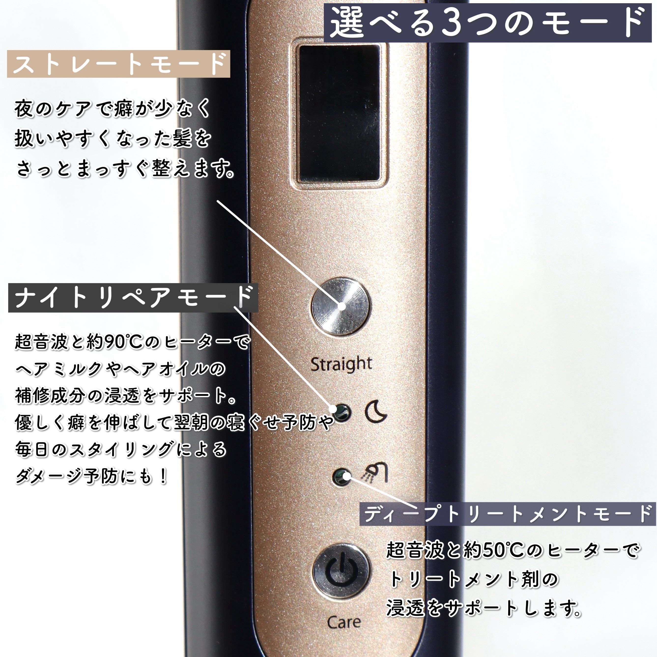 - ヘアドライ後のワンステップで、朝が、髪の質感が変わる。 辿り着いた新習慣「夜アイロン」 ヤーマン独自の低温×超音波テクノロジーで夜のうちに、髪の浸透補修をサポートしながら毛流れを整える。“髪にも美顔器”発想で誕生した、ヘアケアの新習慣「夜アイロン」。 朝が、髪の質感が変わる新習慣「夜アイロン」 スタイリング、湿気、洗髪、ブラッシング… 生活の中で受ける髪ダメージは意外と多いもの。 また、ドライヤーだけで取り切れないクセがあると感じる方は、 なんと約80%※も。 そんなお悩みに応え、 1台で浸透補修×クセ伸ばしをサポートするのが夜アイロン。 ヘアドライ後の仕込みケアで、扱いやすい髪へ。 一日の終わりに、受けた髪ダメージをケアし、 ヘアドライ後の毛流れを整える。 新習慣「夜アイロン」を始めませんか? ※「ヘアケアに関する調査」調査手法:インターネットリサーチ 調査期間:2024年3月15日~3月21日 対象者:全国20-50代女性。髪悩みあり・ヘアケア関心層かつヘアドライを行う方(n=360) ■製品仕様 定格電源:DC12V 4.0A 消費電力:充電時15W、アダプタ駆動時40W サイズ:約50mm×51mm×295mm( W×D×H) 質量:約485g 設定温度: ディープトリートメントモード 50℃ ナイトリペアモード 90℃ ストレートモード 140℃~180 ℃( 20℃刻みの3段階) 材質: PPS+GF、PA+GF、PET+GF、ポリカーボネート、ABS樹脂、ステンレス、アルミ、シリコン 付属品: ストラップ 1個 A Cアダプター 1個 取扱説明書( 保証書付) 型番:YJHB4L