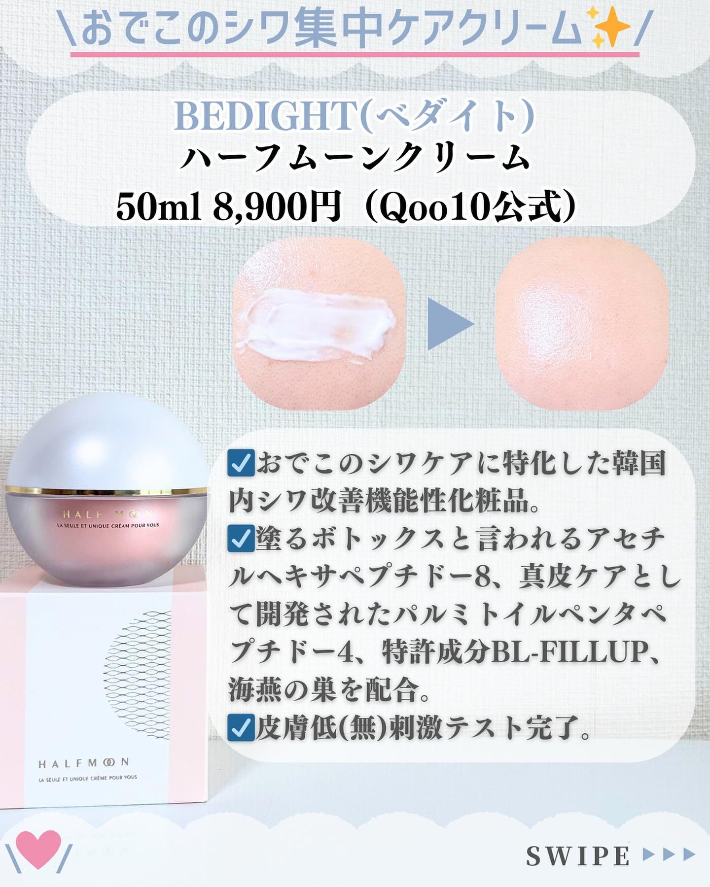 ベダイトは「気になるシワの部位別に選べるクリーム」で肌に刻まれた年を取り除くコンセプトをもとに、プレミアム級のシワクリームを作っています。 エイトクリームはたるんだ口もとの肌や開いた毛穴の凸凹までカバーしキュッと引き締めて、ちゅるんと滑らかで儚げな肌を手に入れることが出来ます。 ハーフムーンクリームは韓国アナウンサー大絶賛!ふっくらおでこになる塗るボトックスクリームです。