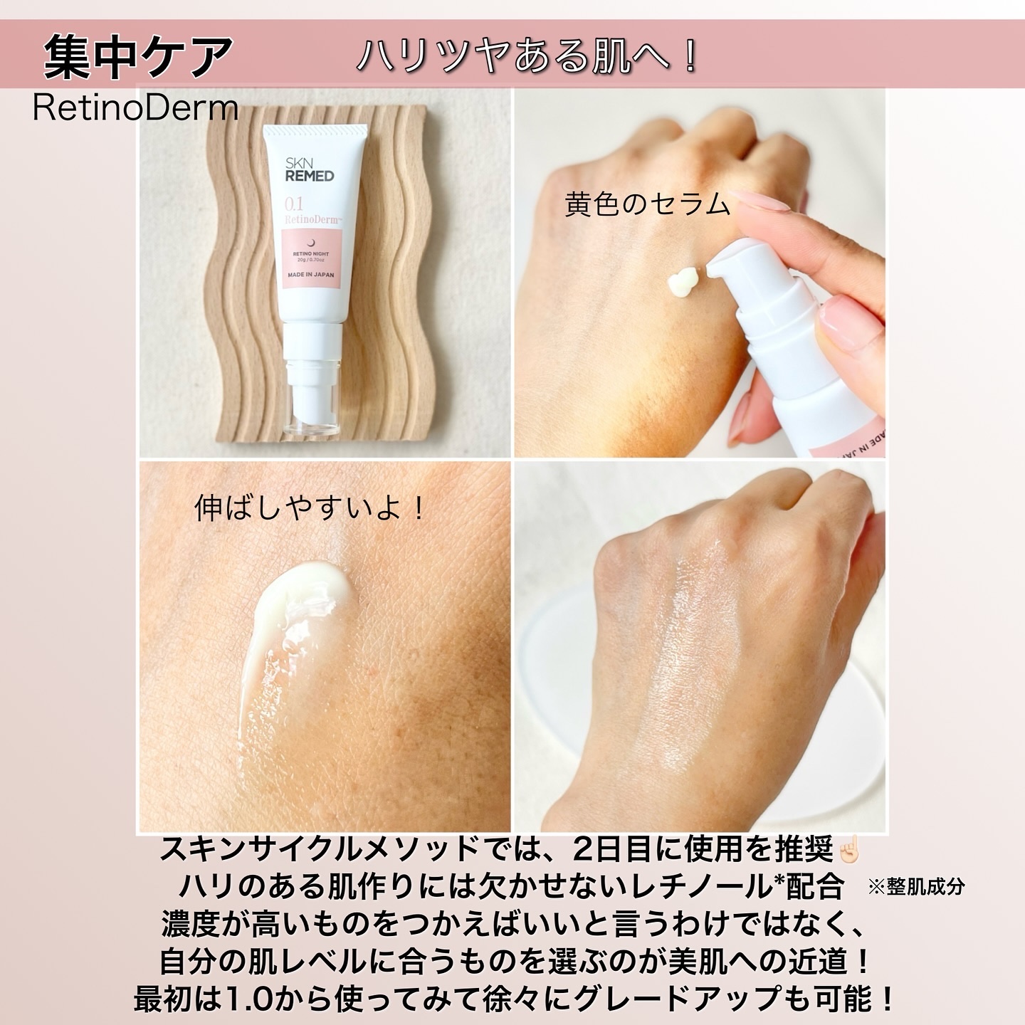 レチノールって、なかなかうまく使いこなせなくない? そんな時にしっかりメソッド、細かく使う頻度やレベルが選べる スキンサイクルメソッドは、毎日同じアイテムを使い続けません。 4日周期のルーティーン内で使い分けるお手入れ方法です。 通院不要で肌管理ができて、コスパも優秀だよ♡ レチノールは欲張り禁物だからゆっくり上手にケアがんばろ