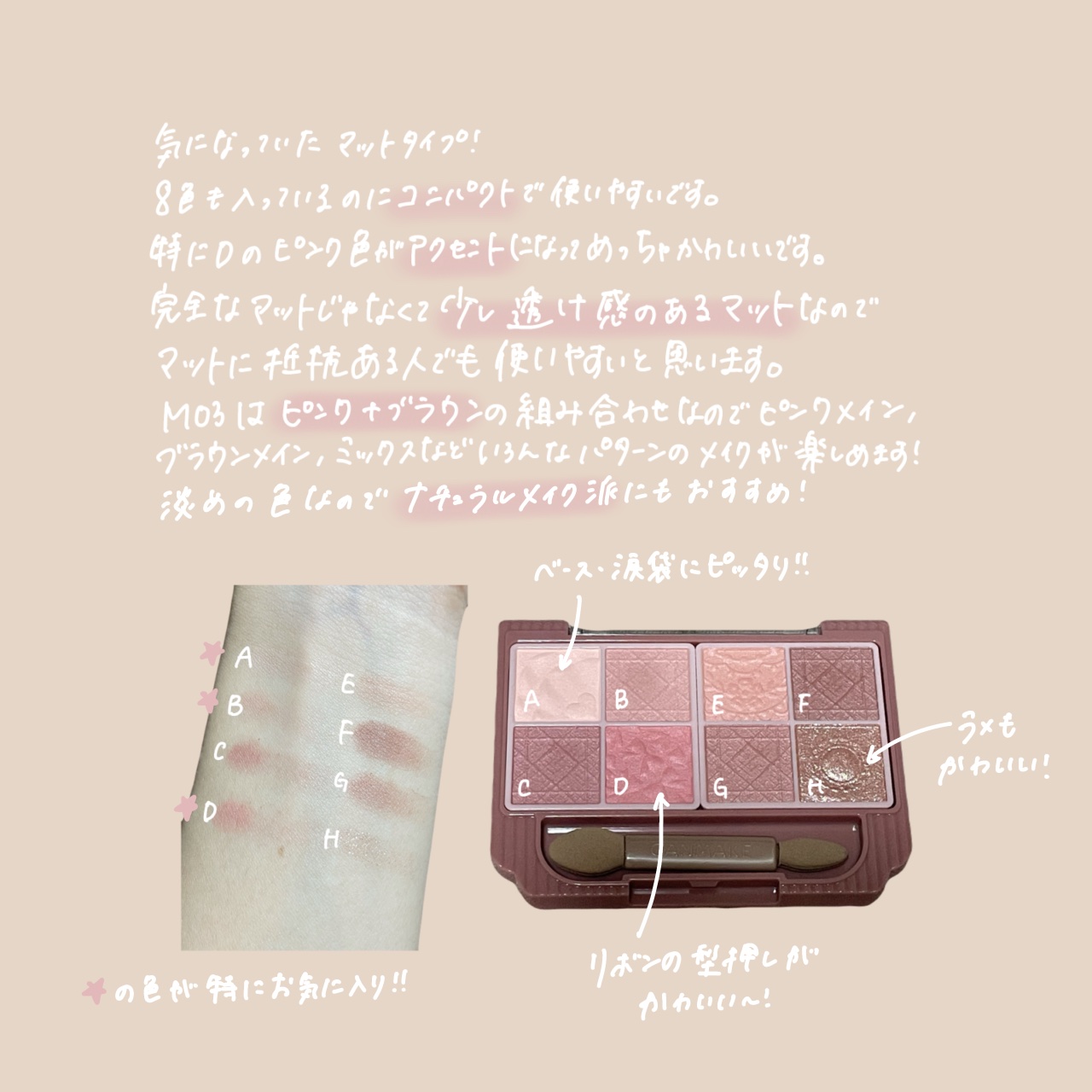 - いつでも一緒♡多色なのに持ち歩ける! 8色入りアイシャドウパレットのマットタイプ♪ 多色パレットでありながら、「持ち歩けること」と「外出先でもメイク直しができること」にこだわったアイシャドウパレット。 ダブルエンドチップ付です♪ マットが大好きな方にも、少し苦手意識がある方にも手に取っていただきたく全色マットor1色ラメ入りの構成にしています♪ (M01:全色マット、M02・M03:1色ラメ入り) 全体は同系色で統一しており、全色使いやすいパレット。 色の組み合わせは自由に♡自分好みのメイクを楽しめます! 【マット】 隠ぺい感とふわっと感を両立させた質感♪ なめらかで重ねても粉っぽくなりにくく、厚塗り感のない仕上がり。 伸びが良いのでムラになりにくく、しっとりフィットして仕上がりを長時間キープ✨ 【ラメ】 ラメ・パールだけがのる透明感のある仕上がり。 高輝度なガラスパール配合で、高見えする輝き✨ なめらかで粉っぽくならず、しっとり密着して仕上がりを長時間キープ! サラサラしたマットシャドウにもラメがしっかり密着する処方を追求しました♪ 蓋にはマット感を表現したすりガラス風のグラデーションデザインが、パウダー部分にはリボンやレース・ボタンの型押しが入っているなど、デザインにもこだわっています♡