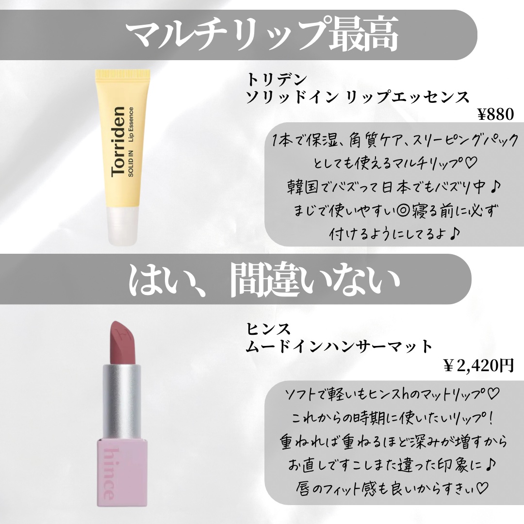 唇は肌と違って皮脂膜がないから潤いがとっっっても!!逃げやすい😨 さらに、ターンオーバーが肌よりも早いから皮向けもしやすい!! いかに、日頃保湿ケアをするか!!で唇の状態は変わるよ🫵🏻💋 保湿効果高くて日常で使いやすいリップの紹介です👏🏻👏🏻 -アベンヌ-薬用リップケアモイスト ¥1,115 -ニベア-ディープモイスチャーリップメルティタイプ ¥636 -DHCー薬用リップクリーム ¥770 -メンソレータム-ヒビプロ ¥1,320 -ヴァセリン-リップ ロージーリップス ¥326 -健英製薬-ベビーワセリンリップ ¥330 -ニベア-リッチケア&カラーリップ ¥847 -レブロン- キス シュガー スクラブ 112 スウィート ミント ¥880