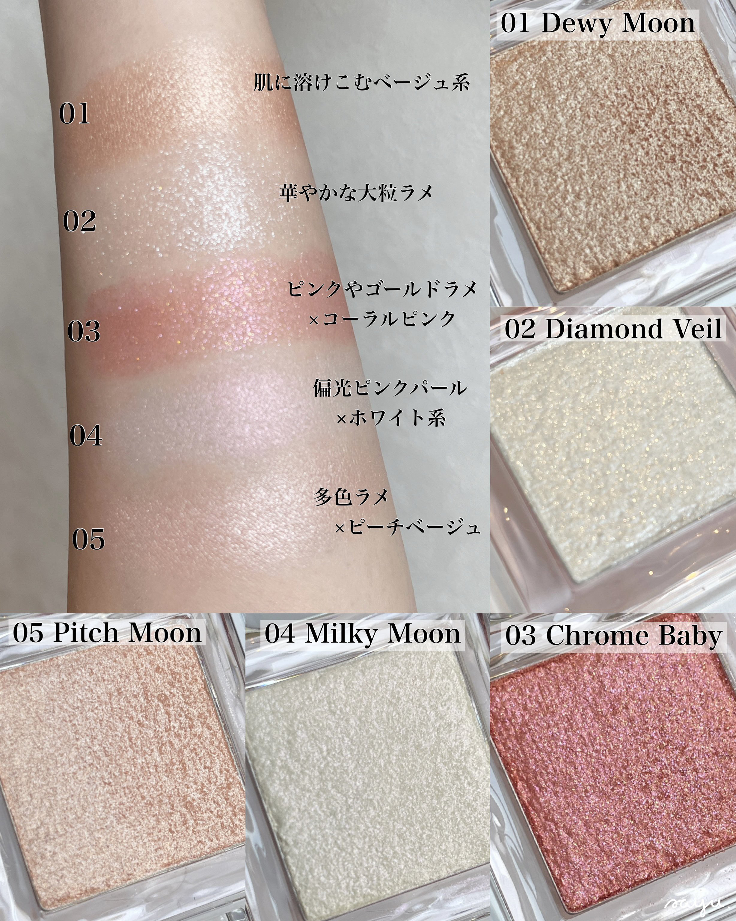 - <01 デュイムーン> 合成フルオロフロゴパイト、酸化チタン、マイカ、(HDI/トリメチロールヘキシルラクトン) クロスポリマー、シリカ、リン酸Ca、ジメチコン、酸化鉄、グリセリン、トリエトキシカプリリルシラン、パルミチン酸イソプロピル、ケイ酸(AL/Mg)、ペンチレングリコール、ミリスチン酸Mg、ポリソルベート20、ステアロイルオキシステアリン酸オクチルドデシル、(アクリルアミド/アクリロイルジメチルタウリンNa/アクリル酸)コポリマー、デヒドロ酢酸Na、オリーブ油脂肪酸ソルビタン、ステアリン酸ソルビタン、イソヘキサデカン、フェノキシエタノール、ソルビン酸K、エチルヘキシルグリセリン、ポリソルベート80、オレイン酸ソルビタン、トコフェロール <04 ミルキームーン> マイカ、酸化チタン、(HDI/トリメチロールヘキシルラクトン) クロスポリマー、ジメチコン、合成フルオロフロゴパイト、シリカ、エチルヘキサン酸セチル、グリセリン、パルミチン酸イソプロピル、ペンチレングリコール、ケイ酸(AL/Mg)、トリエトキシカプリリルシラン、ポリメチルシルセスキオキサン、ミリスチン酸Mg、ポリソルベート20、ステアロイルオキシステアリン酸オクチルドデシル、(アクリルアミド/アクリロイルジメチルタウリンNa/アクリル酸)コポリマー、オリーブ油脂肪酸ソルビタン、ステアリン酸ソルビタン、デヒドロ酢酸Na、イソヘキサデカン、フェノキシエタノール、ソルビン酸K、エチルヘキシルグリセ リン、酸化スズ、ポリソルベート80、オレイン酸ソルビタン、トコフェロール <05 ピッチムーン> マイカ、酸化チタン、合成フルオロフロゴパイト、(HDI/トリメチロールヘキシルラクトン) クロスポリマー、シリカ、ジメチコン、グリセリン、パルミチン酸イソプロピル、ケイ酸(AL/Mg)、トリエトキシカプリリルシラン、ペンチレングリコール、ミリスチン酸Mg、ポリソルベート20、ステアロイルオキシステアリン酸オクチルドデシル、酸化鉄、(アクリルアミド/アクリロイルジメチルタウリンNa/アクリル酸)コポリマー、オリーブ油脂肪酸ソルビタン、ステアリン酸ソルビタン、イソヘキサデカン、酸化スズ、フェノキシエタノール、ソルビン酸K、デヒドロ酢酸Na、エチルヘキシルグリセリン、ポリソルベート80、赤226、オレイン酸ソルビタン、トコフェロール