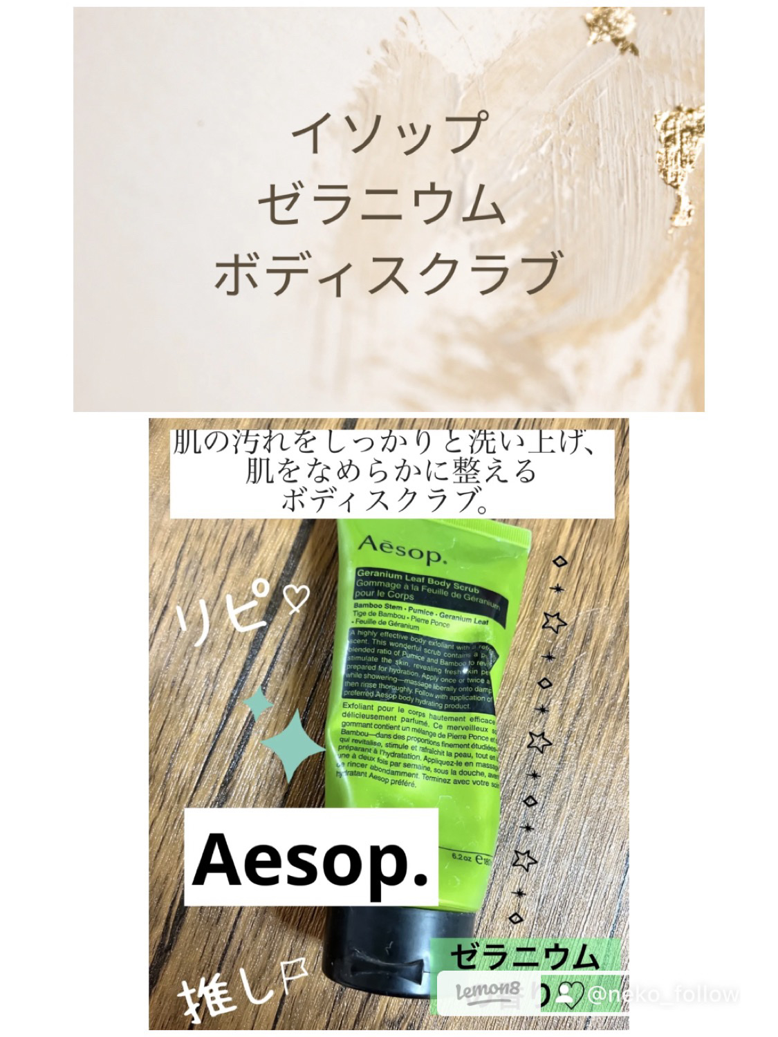 Aesopゼラニウムボディスクラブ180ml。*⑅୨୧୨୧⑅*。これ一本でボディ洗浄とスクラブまで完了する優れものです✨もこもこに泡立つわけじゃないのによく伸びるテスクチャでしっかり洗浄もできてすごいさくらんぼ大2つくらいで全身使えます🍒。*...
