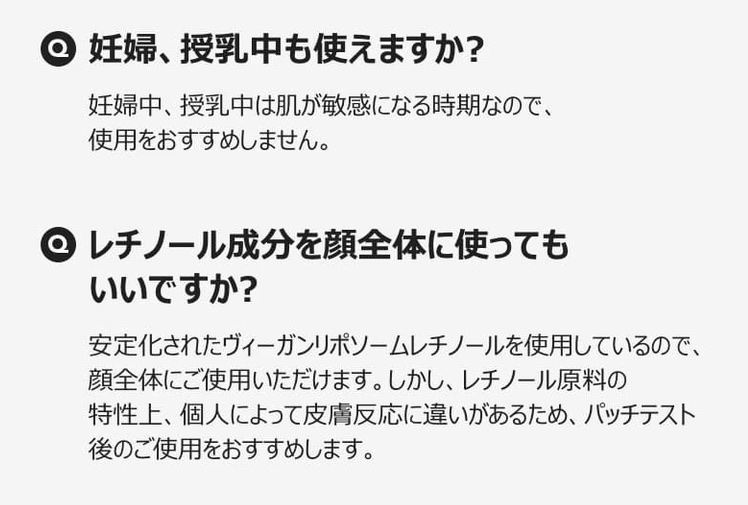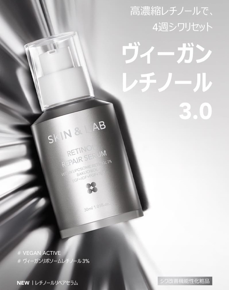 - 刺激を最小限に抑えた使い心地でハリのある肌に導くレチノールセラム ★光と熱に不安定なレチノールを植物性リポソームで安定化させた、SKIN&LABだけのヴィーガンリポソームレチノール*を3%配合。 ★注目の3成分、レチノール*、バクチオール*、ペプチド*配合。 ★年齢を重ねた肌にも潤いやハリを与えるエイジングケアを叶えます。 ★小さいナノリポソームレチノール*で角質層隅々まで浸透し毛穴ケア <成分と効果> ・ヴィーガンリポソームレチノール*:植物性リポソームで安定化させたヴィーガンレチノール*を配合。刺激の少ない使い心地です。 ・バクチオール*:バクチオールは植物由来の成分で肌にハリを与えます。 ・EGF+IGF+FGF+TGF(ペプチド)*:ペプチドは肌本来の力をサポートして、潤いの持続する肌へと導きます。 *整肌成分