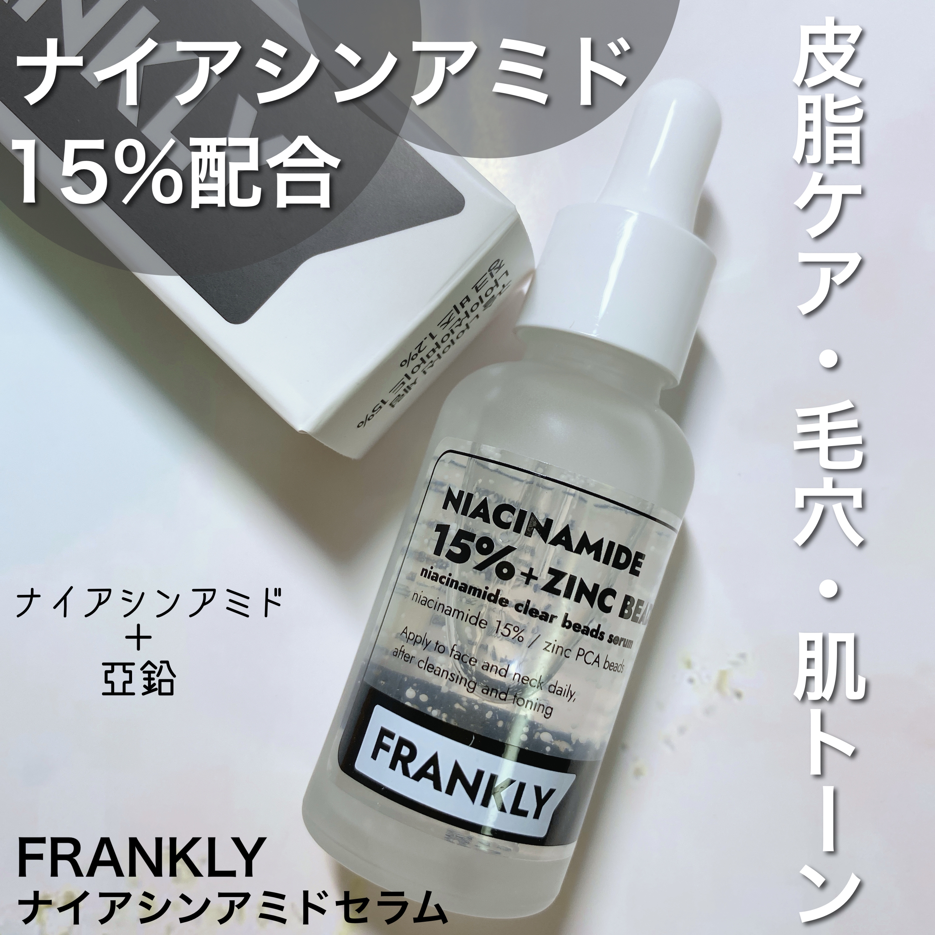 ♡♡♡毛穴も皮脂もケアしたい人、必見!FRANKLY(フランクリー)の「ナイアシンジンクビーズセラム」使ってみたよ!ナイアシンアミド15%とビーズ化ジンクPCA配合で、毛穴悩みにアプローチ。肌にピタッと密着するビーズがまるでスポットパッチみた...