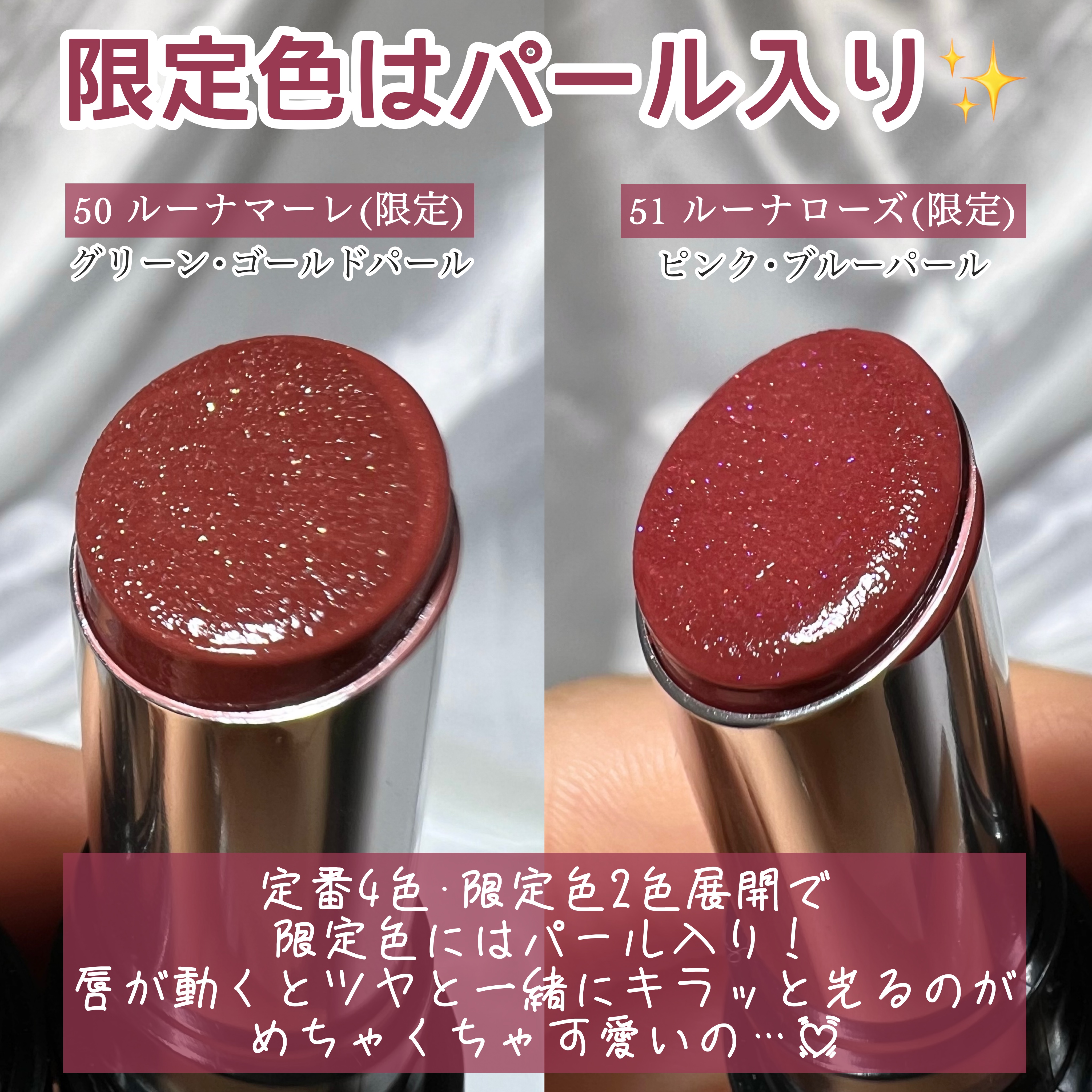 艶大好き人間の私。 めっちゃめっちゃ可愛い限定リップにきゅんきゅんです🫶💞 50 ルーナマーレはいい女感あるブラウン系。パールでツヤっと色っぽい唇に💋 51 ルーナローズは程よいローズピンクがオシャレ✨ パールのツヤめきが綺麗だよ🫶💞