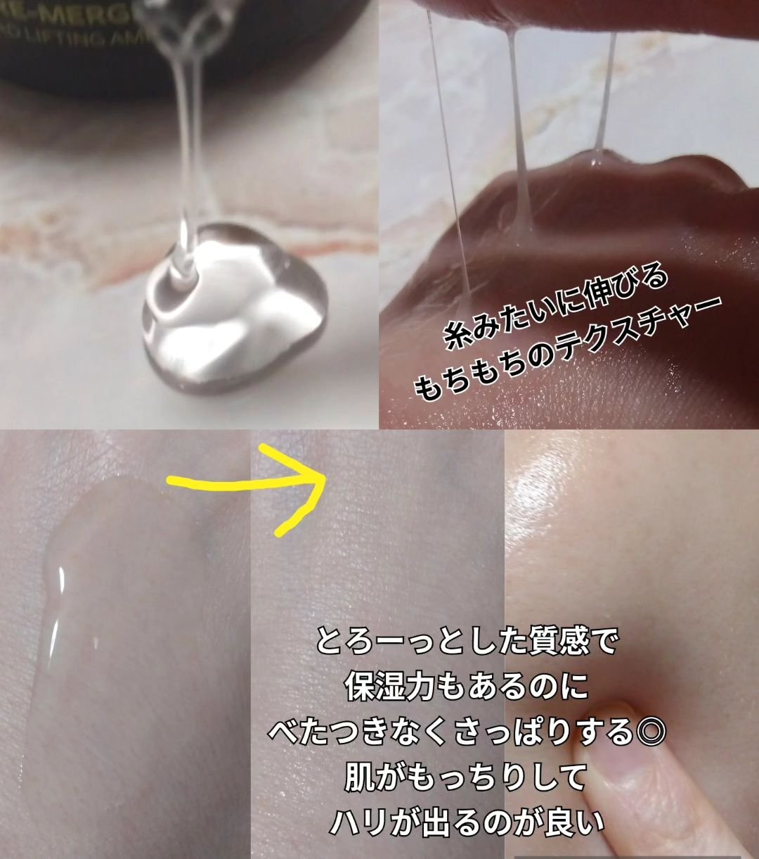 ビヨーンとのびる不思議なアンプル✨ 年齢とともに気になってくるお顔周りのたるみ😭 そのケアに特化しているアンプルで、ビヨーンとねばねばしたアンプルなのに馴染ませるとベタつかない不思議なテクスチャー! 糸リフティングと同一原理の吸収糸が配合されているんだそうです👀 (10,000 PPM) それだけではなく、🍀コラーゲン 🍀エラスチンなどで弾力や引き締め効果もあるんだそうです✨ この贅沢成分を浸透率を高めるためにスピキュールも配合されているんだそうです!チクチク感は感じないのでスピキュール苦手な方にもおすすめ😊