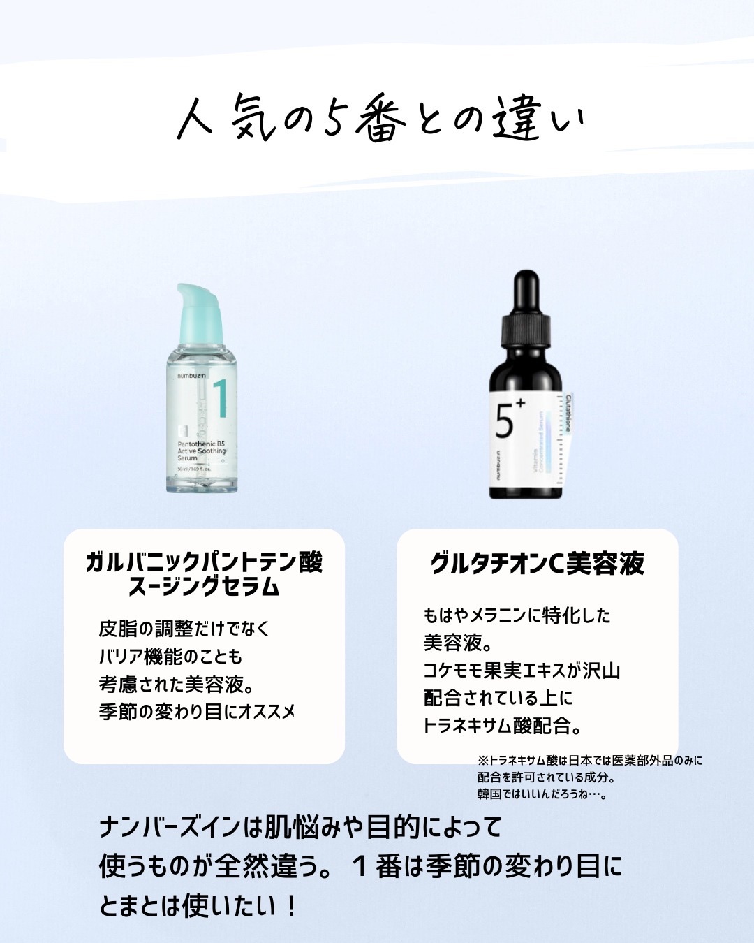 水分たっぷりの1番セラム💧 ナンバーズイン 1番 ガルバニックパントテン酸*1スージングセラム ほんの気持ちのとろみとサラッと水分たっぷりのみずみずしい使用感で油分感やベタつきも少なく、朝晩使いやすいさっぱりしっとり感🥰 ナイアシンアミド*2が4%配合で、透明感*3のある肌へ😳 皮脂ケアしつつ水分チャージしてくれるから、脂性肌寄りの混合肌(インナードライ)の悩みにアプローチしてくれるアイテムで私にぴったり🙌🏻