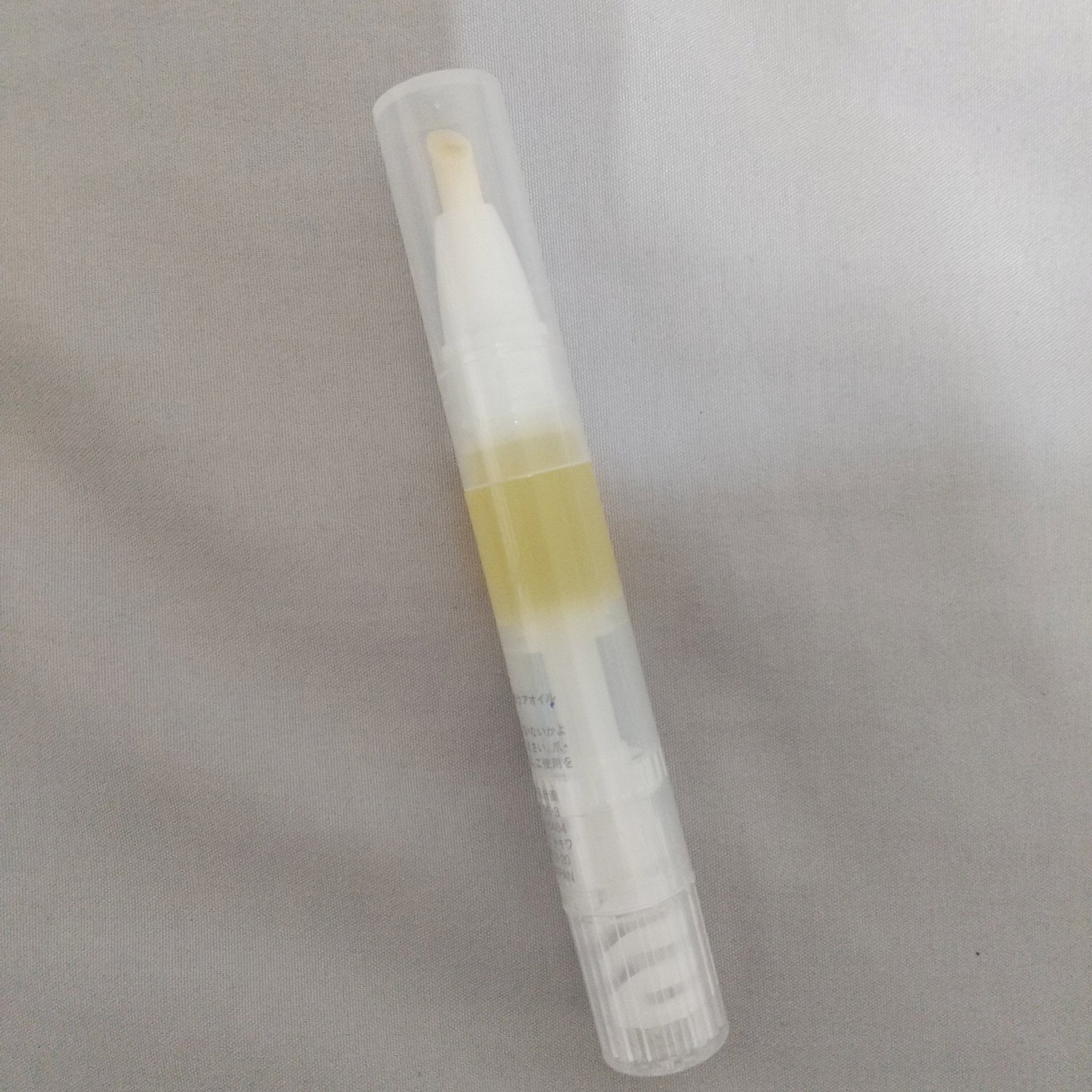 持ち歩き用で使っています。ペンのような形で先は刷毛になっています。 スキマ時間にササッと塗れて、オイルがサラサラではないので垂れたりすることもありません。 黄色の方は甘皮ケアオイルで、こちらはお家で使っています。