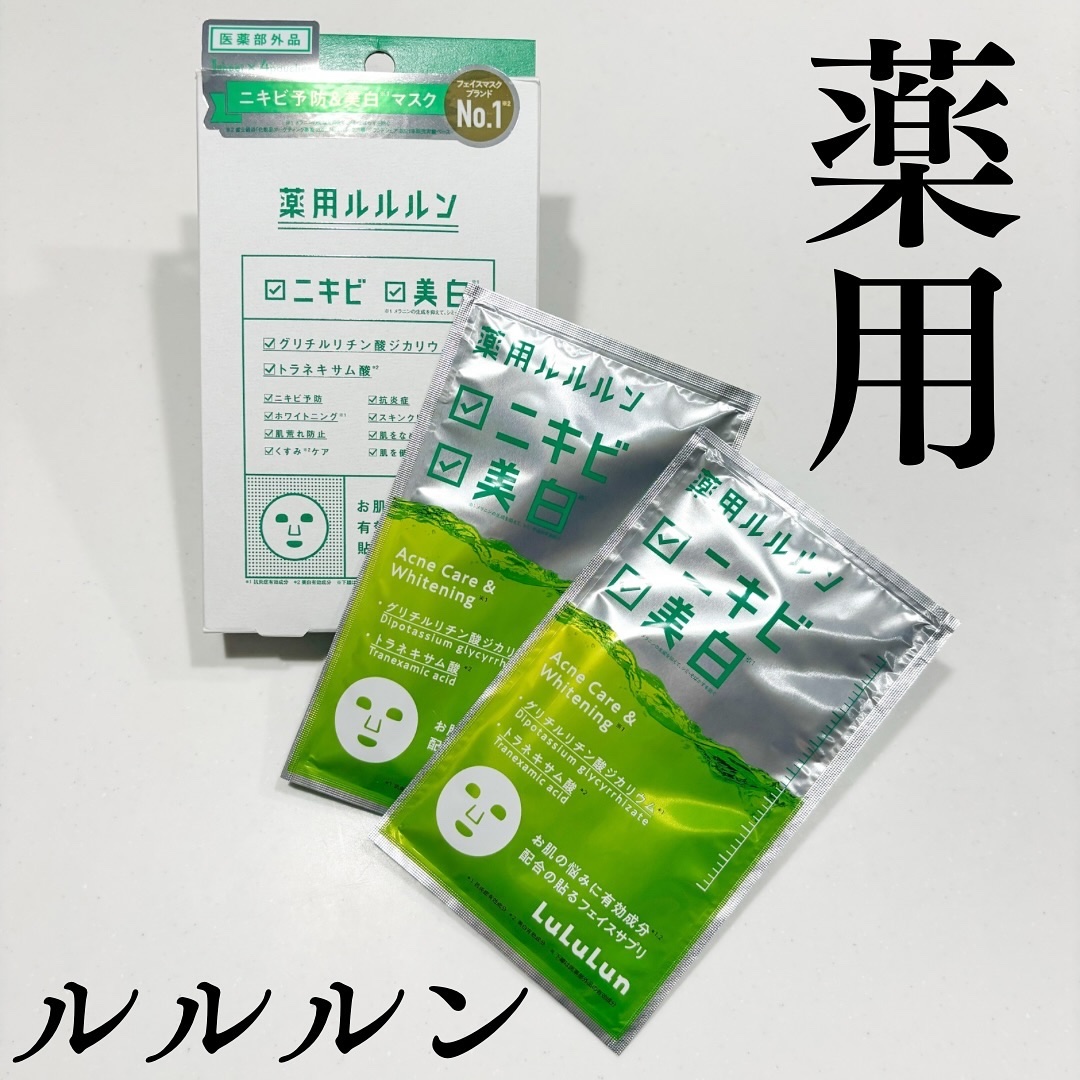 - 【医薬部外品】 ルルルン初の医薬部外品、「薬用ルルルン」が登場。 「薬用ルルルン 美白アクネ」はニキビを予防したい方、美白※1・くすみ※2をケアしたい方におすすめ。 (※1 メラニンの生成を抑えて、シミ・そばかすを防ぐ ※2乾燥による)
