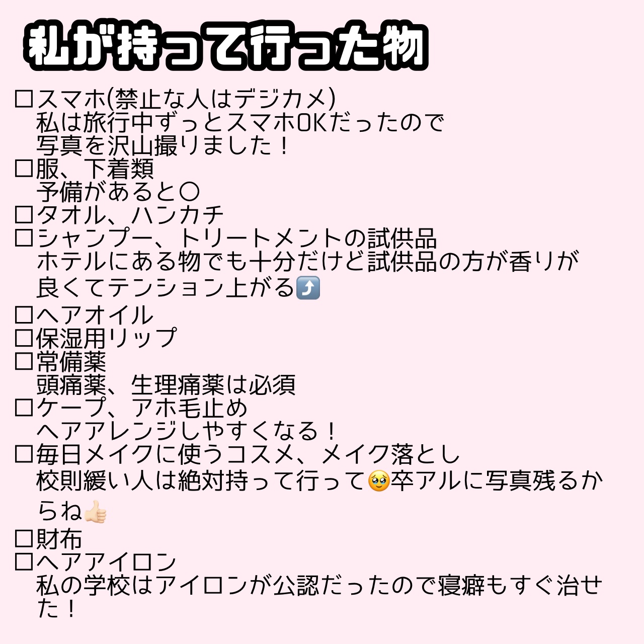 わぁぁぁぁめっちゃ参考になります🥹修学旅行楽しむために準備しっかりします♡