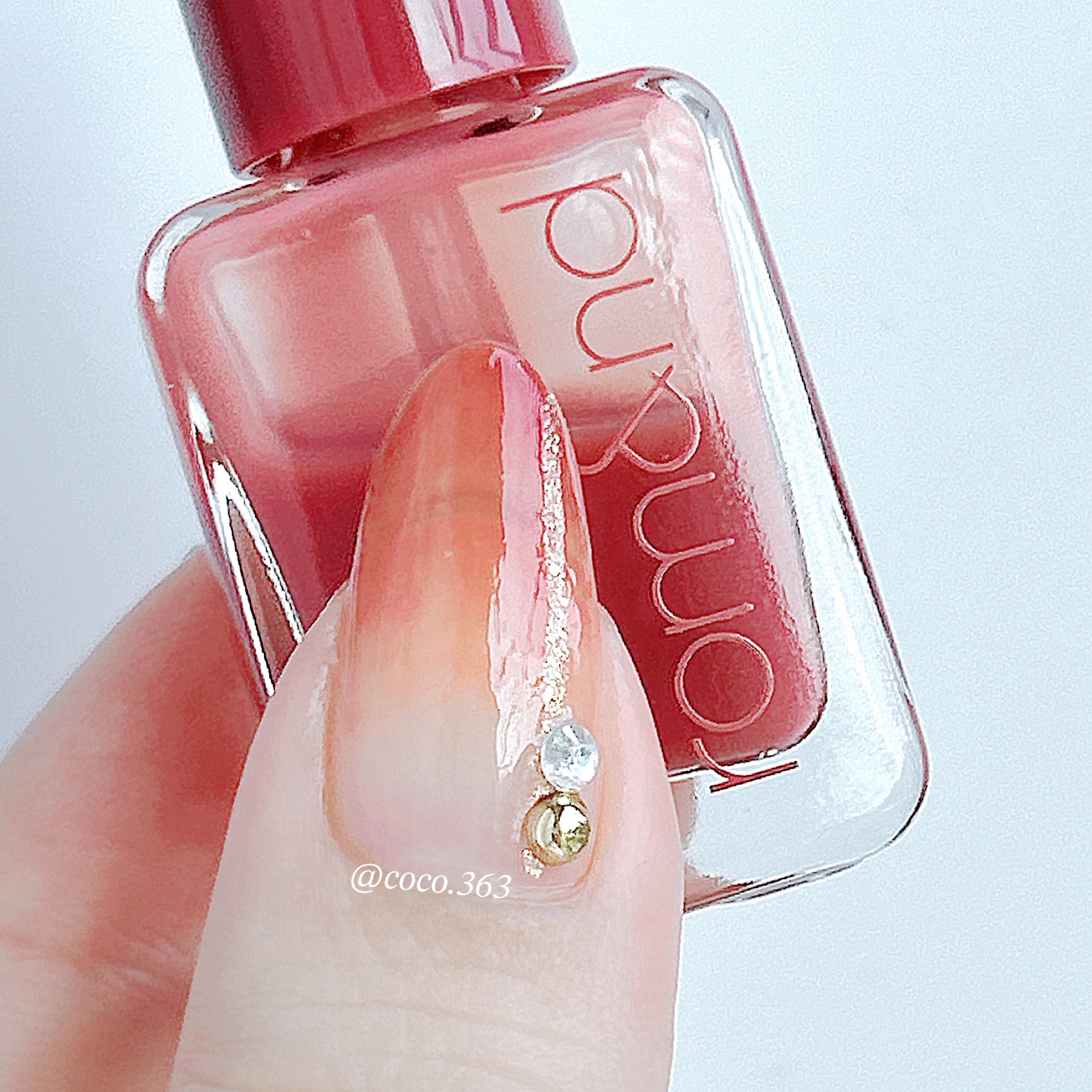 ジューシーな桃の果汁みたいなくすみピンクって感じでめっちゃかわゆい🥹🍑 なんといってもお手頃価格なのが嬉しい!ネイルって発色とかムラになりやすさとかわかんないからこのくらいの価格だと手に取りやすい! 光に当たるとちゅるんってしてめっちゃ可愛いよー🥹💕