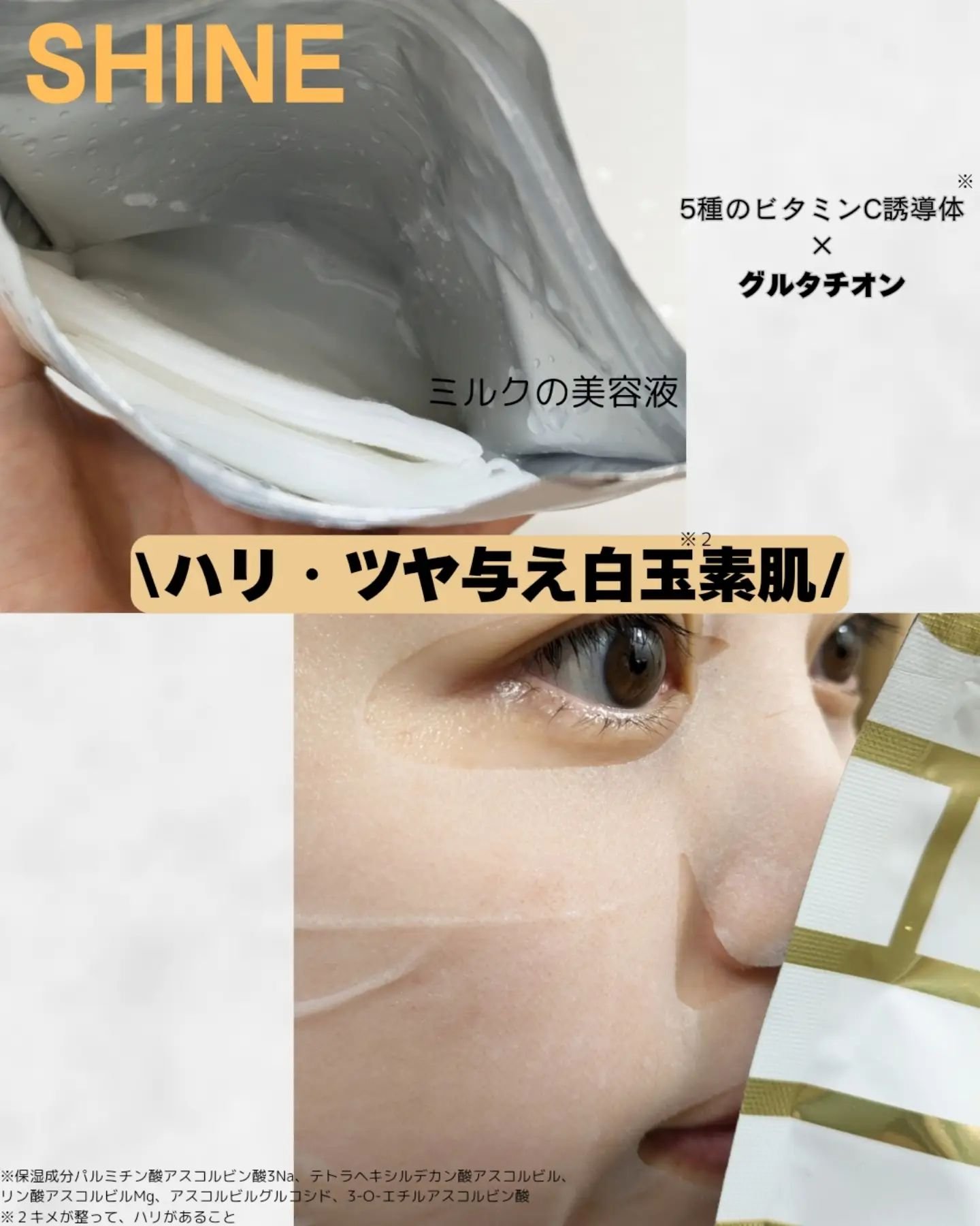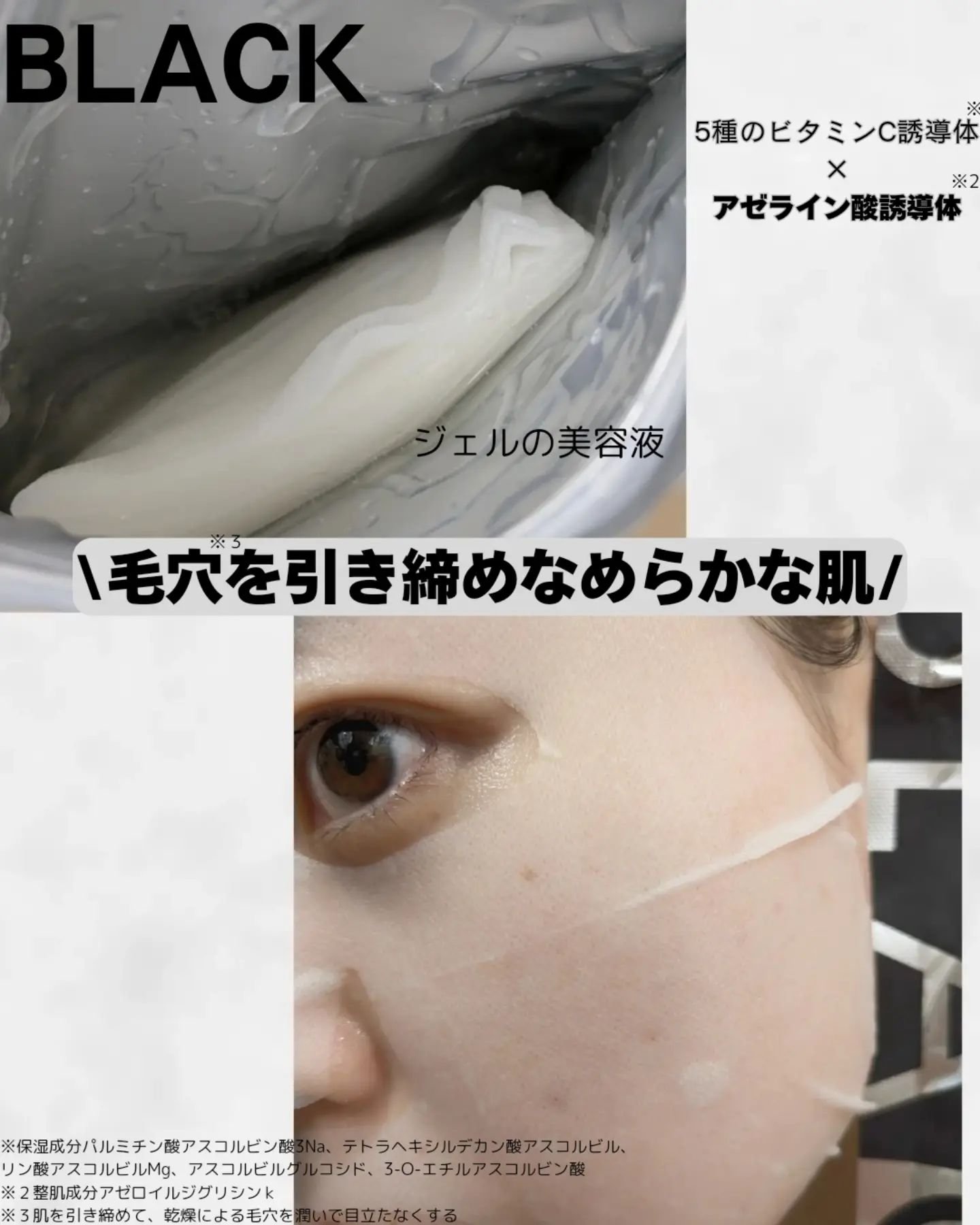 肌悩みに合わせて選べる2種類の「土台ケア」🥰 ベース デイリーケアマスク(SHINE/BLACK) グルタチオンやアゼライン酸など美容医療でも人気の成分が配合されてて、最短5分で簡単に潤いをチャージ💖 5種類のビタミンC誘導体配合🍋 持続型、安定型、速効型、浸透型の効果を発揮✨