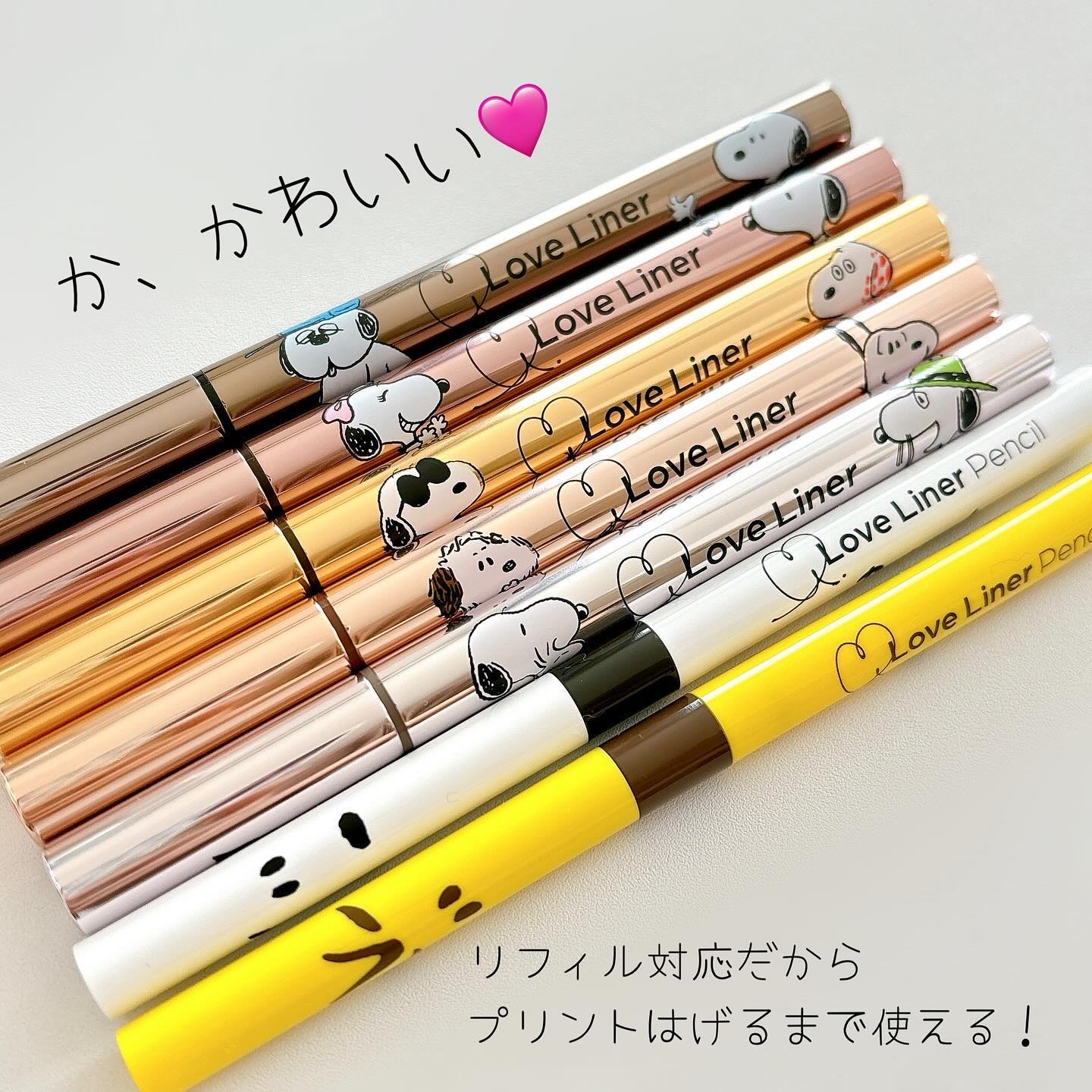 Love Linerからスヌーピーコラボのリキッドアイライナー5色とペンシルアイライナー2色を数量限定で販売されたって! リキッドアイライナーにかんしては専用リフィルを付け替えることでスヌーピーデザインのボトルを繰り返し使うことできるんやって🪿🌱🍃🤍 しっかり色づくのに滲みにくく、お湯で簡単に落とせて嬉しい🩶