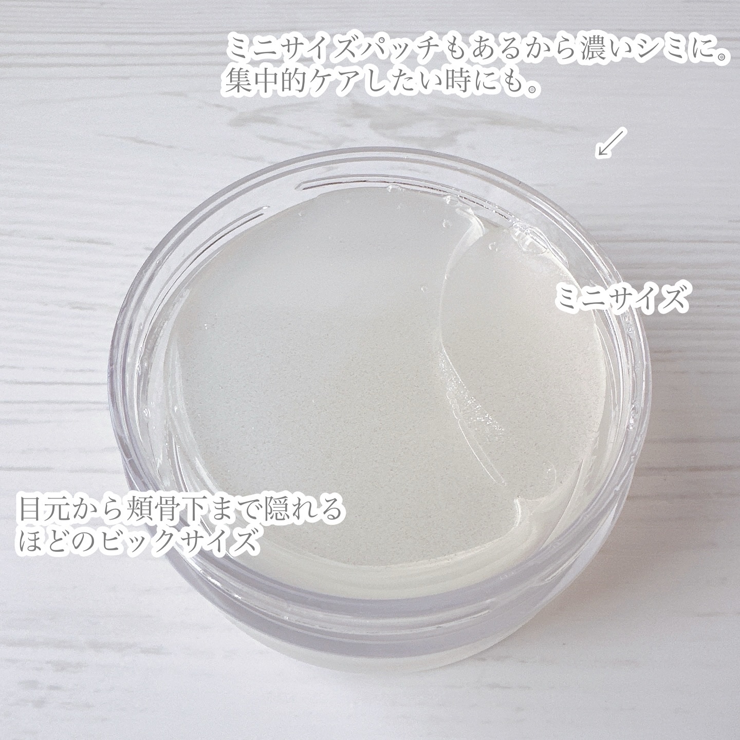 高純度99%のグルタチオンが配合されてるよ🫣✨️ さらに、シワ改善・シミ予防・美白効果のあるナイアシンアミドも配合で美白、くすみ、シワケアに特化したパッチだよ◎ 有効成分が溶け込むゲル生地で、すき間なくぴたーっと密着してズレないところが良い🥹 これほんとにお気に入りで使い始めてからずっとリピしてる🥹 みんなも使ってみてね♡