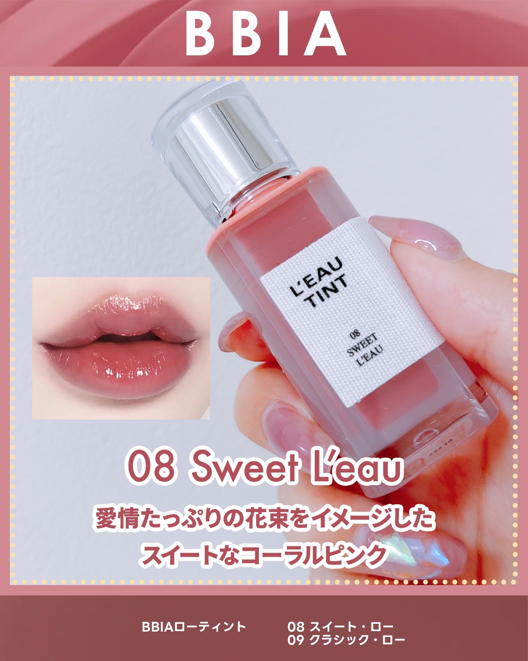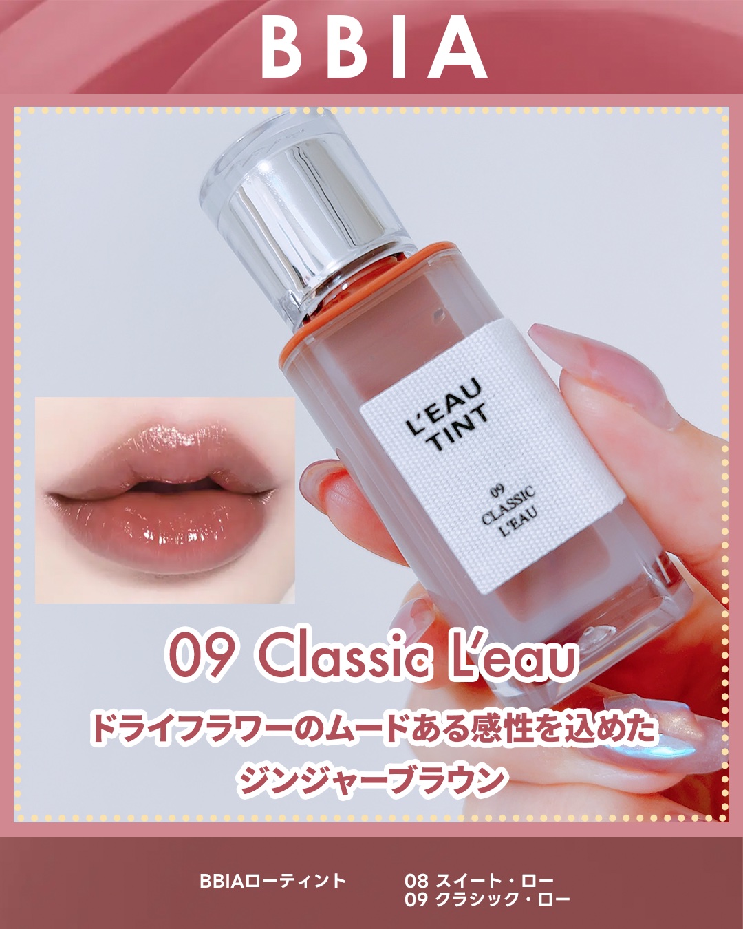 - - うるおいリップなのにしっかりカラーが定着し、時間が経っても塗りたてそのままのカラーを維持 *色が落ちにくいことから「飲み会リップ」としてSNSで話題に - 水のように軽くて快適なグロウティント、塗り重ねるほど鮮やかで透明に浮き上がる水彩画カラー - 香水瓶をイメージしたBBIA初のカスタムデザイン。パッケージはもちろん、カラーとテクスチャーに真心を込めて開発