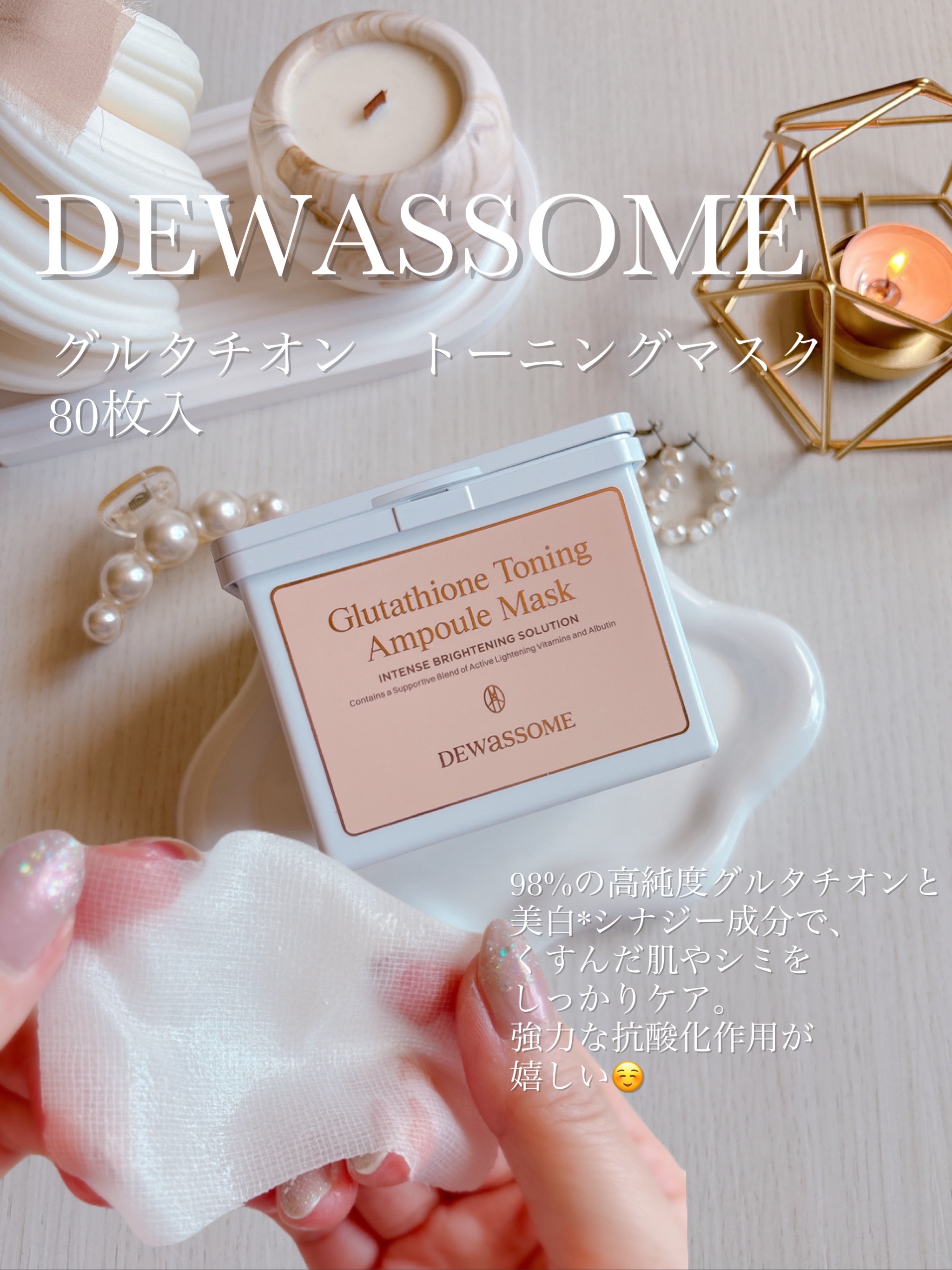 韓国では5秒に1個売れている!DEWASSOMEおすすめ商品紹介🪞 純度98%グルタチオン配合の🤍グルタチオンマスクパック(80枚入) セラム単体でも肌トーンが調整され綺麗な透明感爆上がりで、化粧崩れも気になりませんでした✨