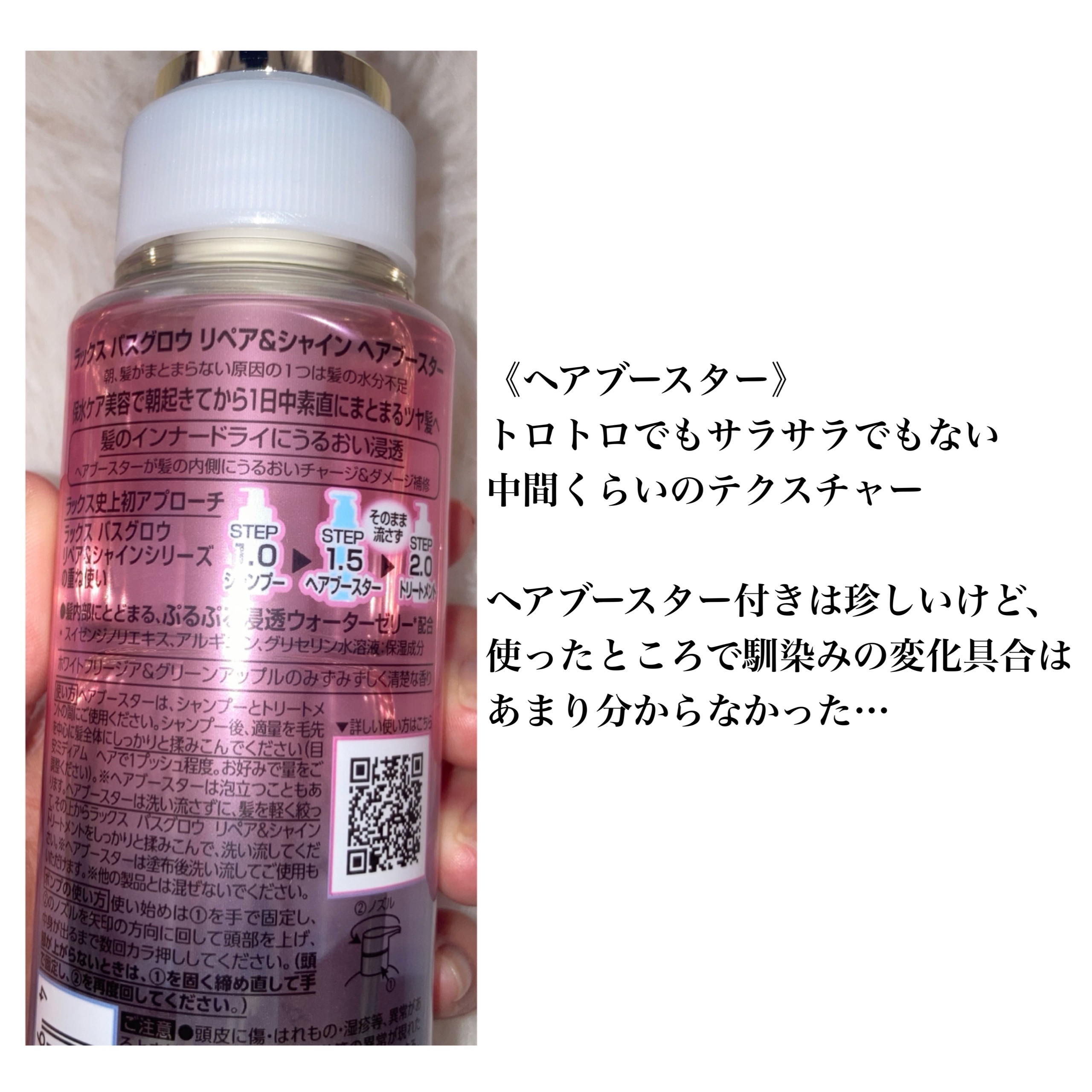 朝、髪がまとまらない原因の1つは髪の水分不足 保水ケア美容で、朝起きてから1日中素直にまとまるツヤ髪へ シャンプーは泡立ち良く洗いやすい印象 ヘアブースターはとろみのあるテクスチャでスッと馴染んでくれてました! 香りはホワイトフリージア&グリーン 清潔感のある優しい香りがお気に入り!