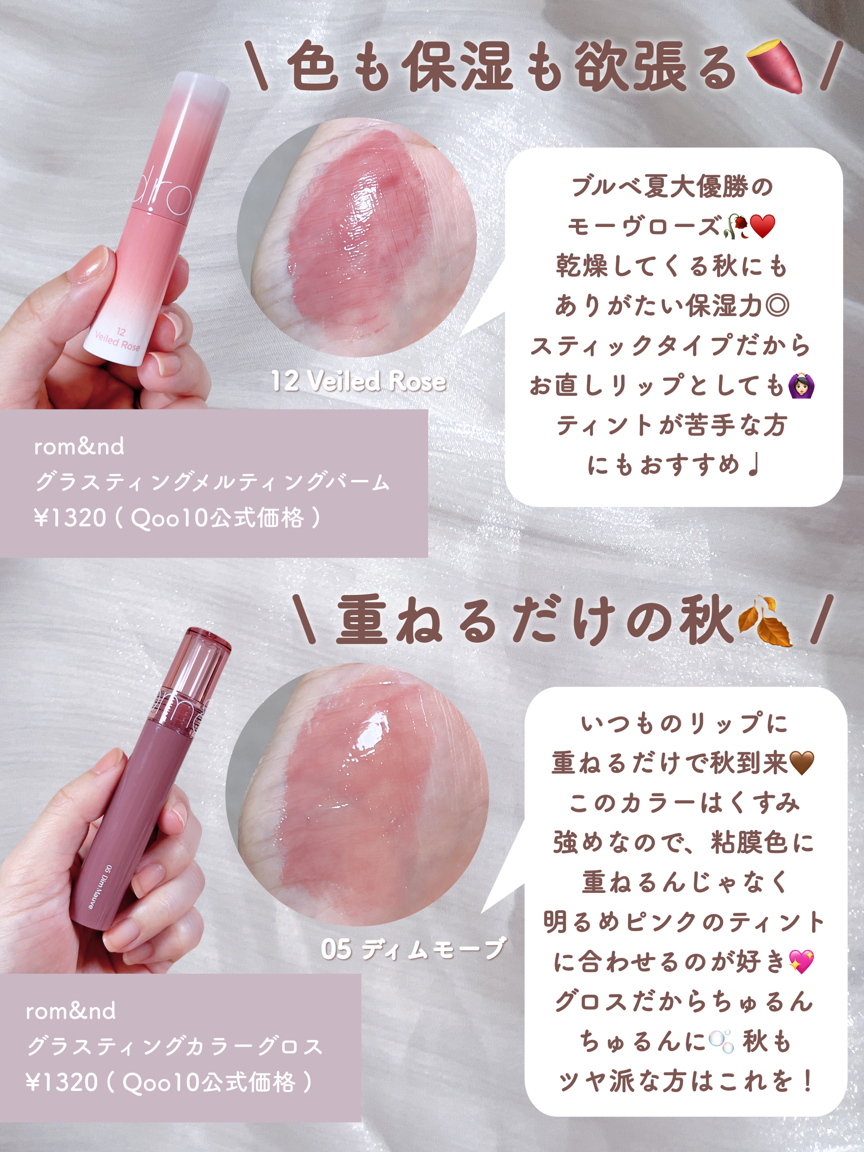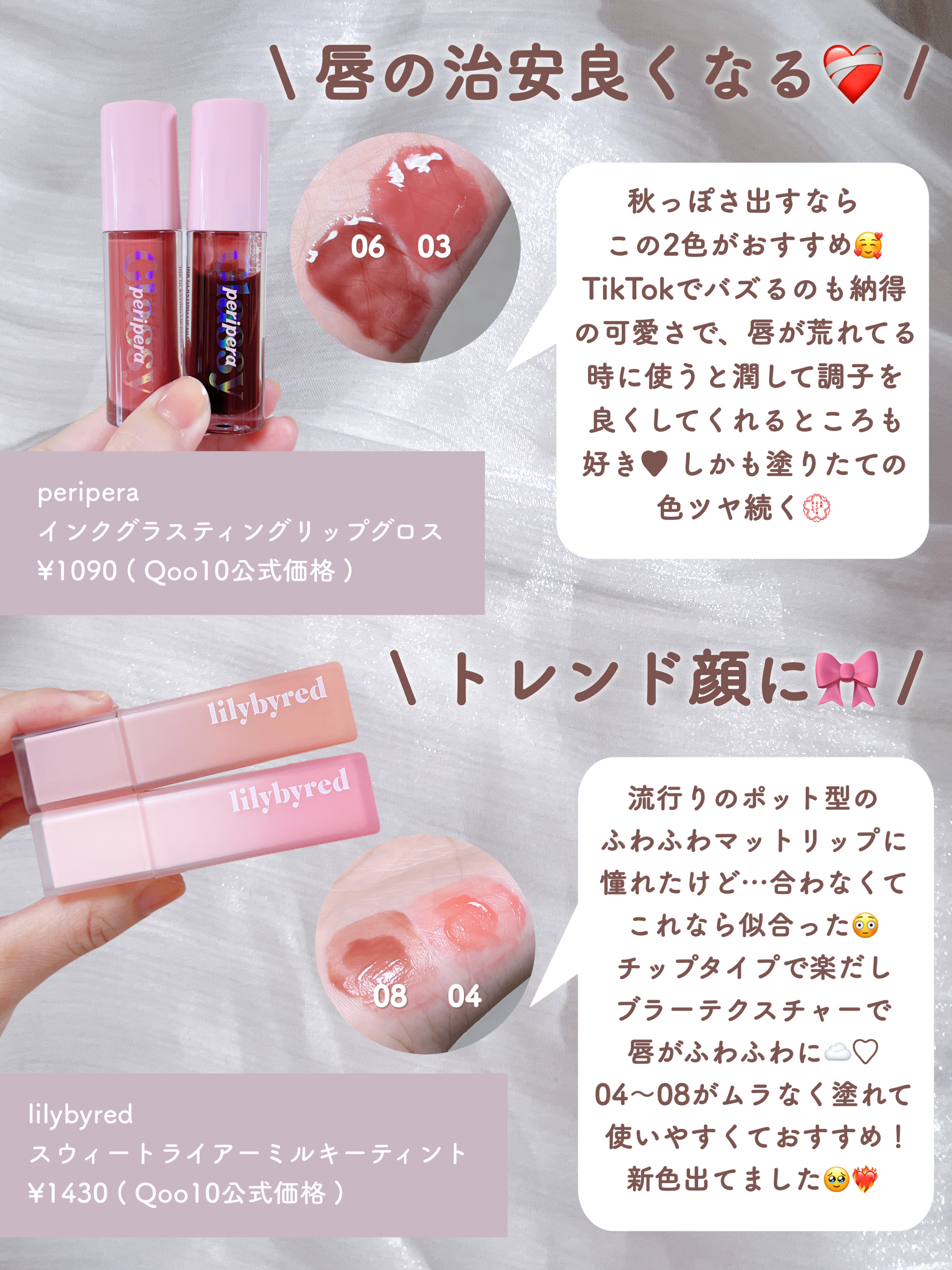 私は色持ちの他に'落ち方が綺麗か'も重要視しているのでそこも入れてみました☆ 私は2ndイエベ春なので、イエベさんのブルベ寄せメイクにも使えると思います! ♥rom&nd グラスティングメルティングバーム 12 ヴェールドローズ ♥ロムアンド ゼロマットリップスティック 22 モーヴビーンズ ♥rom&nd デュイフルウォーターティント 16 チアリーピンク ♥アンドバイロムアンド グラッシーボムティント BR02 ローズビーン ♥KATE リップモンスター 13 3:00AMの微酔 ♥Laka フルーティーグラムティント 111 メロウ ♥Laka ボンディンググロウリップスティック 204 ハヴ ♥ラカ ジェリーイングヌードグロス 306 エンジェルリング ♥AMUSE デューティント ジューシーモモ ♥EQUMAL ノンセクショングローリーティント リトルブラック 108 SOOTY HAZE ♥banilaco グロウベールティント PK01 Nudy Near