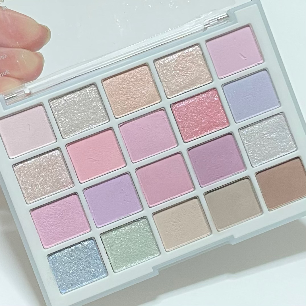 粉質は柔らかく、ふわっと密着します。 10 MUSHROOM マット。グレー系のベージュ。 20 TWO SHOT AMERICANO マット。アイライナー使いにもできるしっかり目のダークブラウン。 22 BEBE パール。涙袋にぴったりのベージュ系カラー。 40 SUPER PINK マット。しっかりと華やかなピンク。 42 CHEW グリッター。ミルクピンクをベースに、ピンクとゴールドラメ入り。 45 BLUSH GREY マット。くすみグレー。 38 PINK ATTENTION 繊細なラメ。偏光パールぽく輝くピンクトーンのハイライト。