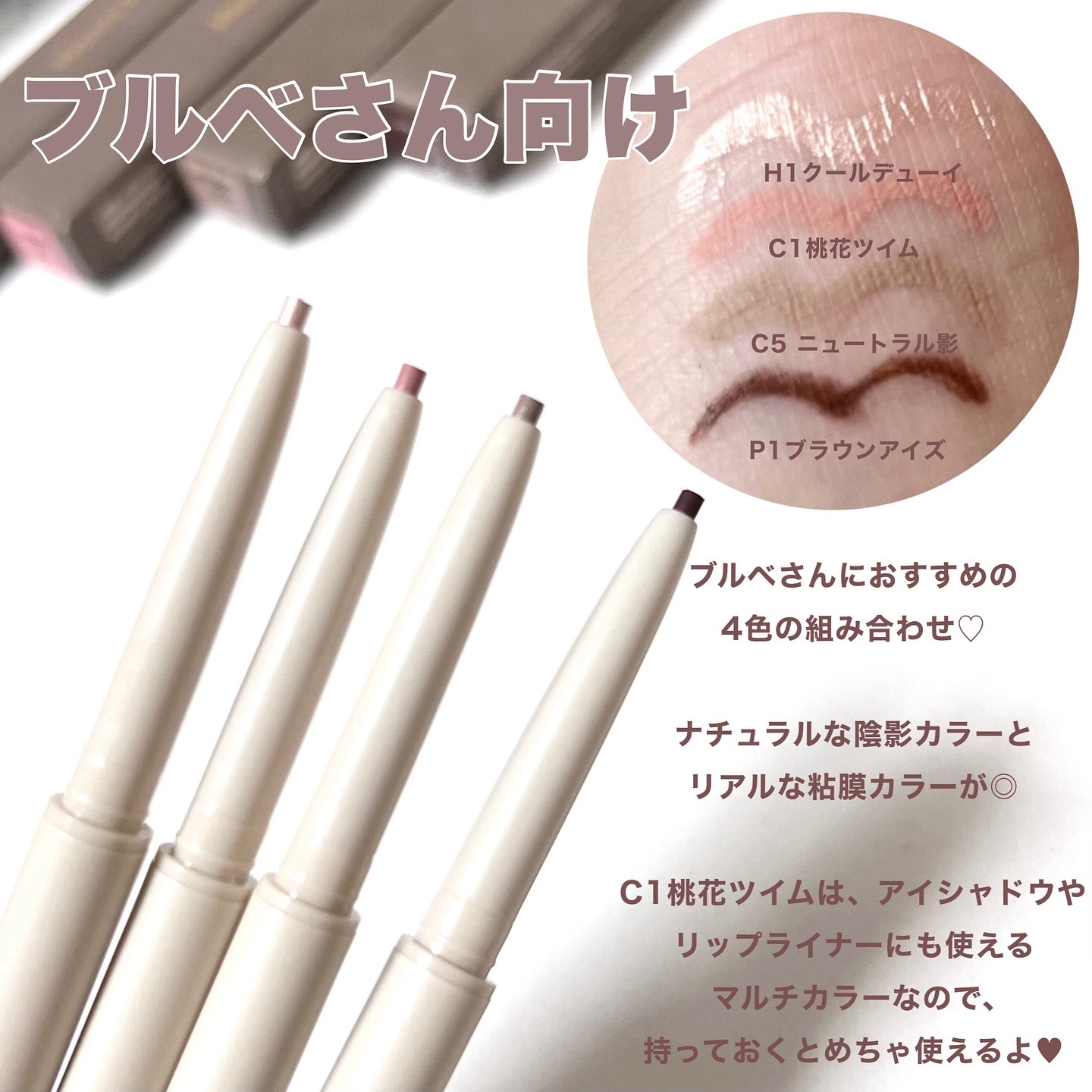 目元拡張、涙袋、陰影、アイライン、粘膜のカラーが揃っていて、ナチュラルにデカ目を演出できるアイライナーです✨ お気に入りはC3ローズツイム🌹 上まぶたのカラーにも可愛いし粘膜ラインにぴったりで、たくさん出番がありそうです🥰 なめらかに描けるライナーで、しっかり定着してくれます🫶🏻 密着力高いので、ぼかしたい場合は塗ってすぐぼかしてください❕