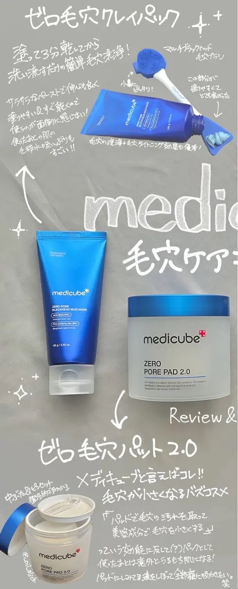 ゼロ毛穴パッドは、洗顔で落としきれない角栓・毛穴汚れ・皮脂をオフしてくれる拭き取りパッドです。夏場は特に皮脂が多く出て毛穴に皮脂汚れが溜まり、汚れが蓄積されて更に毛穴が大きくなります💦 ちくちく感がくせになる天然由来の美容針!毛穴よりも小さい美容針入りの美容液は去年頃から大人気ですよね🥹 今年の暑い夏で大きくなってしまった毛穴やたるみ毛穴など様々な毛穴悩みの方に是非おすすめのmedicube毛穴ケア製品のご紹介でした🫶🏻