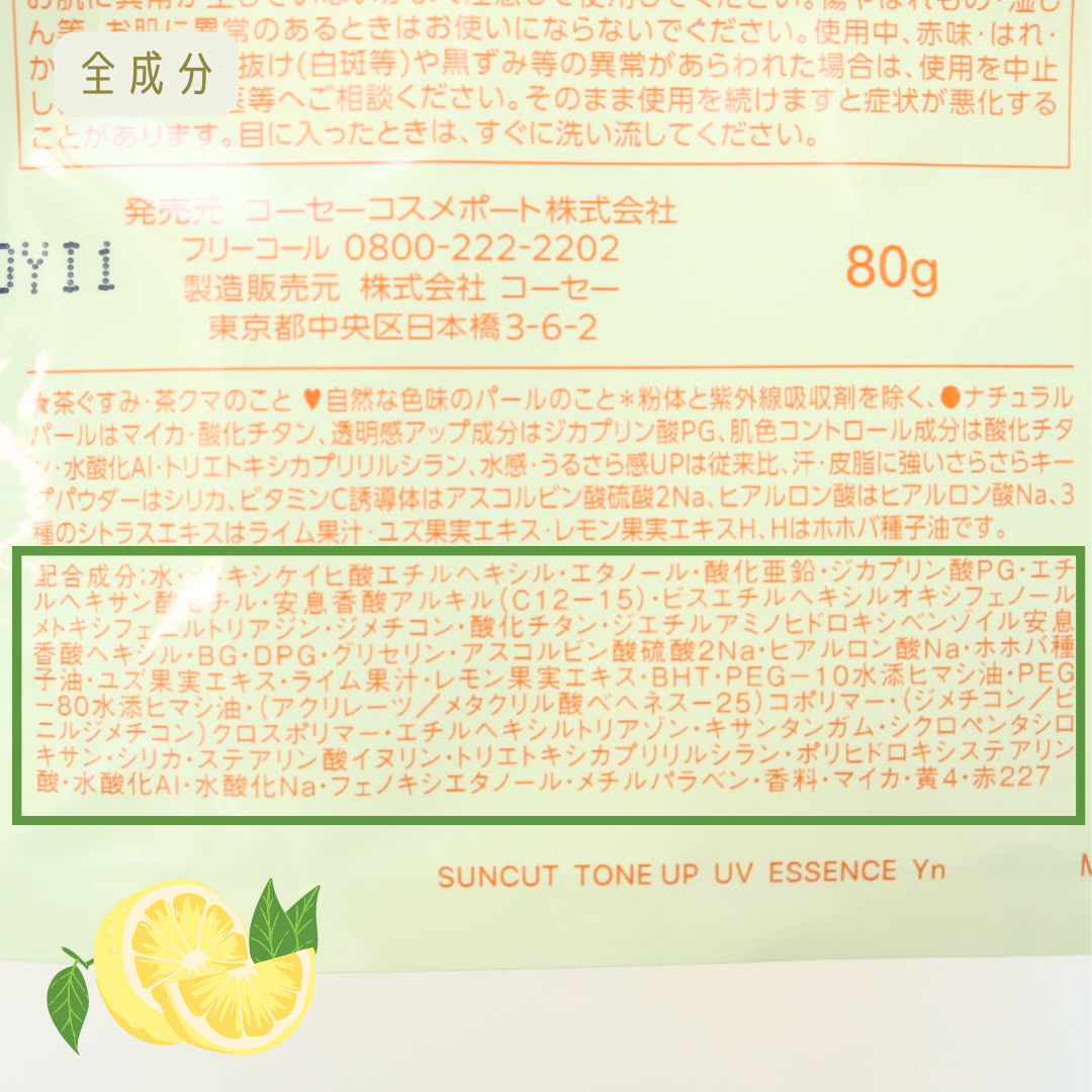- <ミントグリーン> 水、メトキシケイヒ酸エチルヘキシル、エタノール、酸化亜鉛、ジカプリン酸PG、エチルヘキサン酸セチル、安息香酸アルキル(C12-15)、ビスエチルヘキシルオキシフェノールメトキシフェニルトリアジン、ジメチコン、ジエチルアミノヒドロキシベンゾイル安息香酸ヘキシル、BG、DPG、グリセリン、アスコルビン酸硫酸2Na、ヒアルロン酸Na、ホホバ種子油、ユズ果実エキス、ライム果汁、レモン果実エキス、BHT、PEG-10水添ヒマシ油、PEG-80水添ヒマシ油、(アクリレーツ/メタクリル酸ベヘネス-25)コポリマー、(ジメチコン/ビニルジメチコン)クロスポリマー、エチルヘキシルトリアゾン、キサンタンガム、シクロペンタシロキサン、シリカ、ステアリン酸イヌリン、トリエトキシカプリリルシラン、ポリヒドロキシステアリン酸、水酸化Al、水酸化Na、フェノキシエタノール、メチルパラベン、香料、マイカ、酸化チタン、黄4、青1 <ラベンダー> 水、メトキシケイヒ酸エチルヘキシル、エタノール、酸化亜鉛、ジカプリン酸PG、エチルヘキサン酸セチル、安息香酸アルキル(C12-15)、ビスエチルヘキシルオキシフェノールメトキシフェニルトリアジン、ジメチコン、ジエチルアミノヒドロキシベンゾイル安息香酸ヘキシル、BG、DPG、グリセリン、アスコルビン酸硫酸2Na、ヒアルロン酸Na、ホホバ種子油、ユズ果実エキス、ライム果汁、レモン果実エキス、BHT、PEG-10水添ヒマシ油、PEG-80水添ヒマシ油、(アクリレーツ/メタクリル酸ベヘネス-25)コポリマー、(ジメチコン/ビニルジメチコン)クロスポリマー、エチルヘキシルトリアゾン、キサンタンガム、シクロペンタシロキサン、シリカ、ステアリン酸イヌリン、トリエトキシカプリリルシラン、ポリヒドロキシステアリン酸、水酸化Al、水酸化Na、フェノキシエタノール、メチルパラベン、香料、マイカ、酸化チタン、青1、赤227 <レモンイエロー> 水、メトキシケイヒ酸エチルヘキシル、エタノール、酸化亜鉛、ジカプリン酸PG、エチルヘキサン酸セチル、安息香酸アルキル(C12-15)、ビスエチルヘキシルオキシフェノールメトキシフェニルトリアジン、ジメチコン、酸化チタン、ジエチルアミノヒドロキシベンゾイル安息香酸ヘキシル、BG、DPG、グリセリン、アスコルビン酸硫酸2Na、ヒアルロン酸Na、ホホバ種子油、ユズ果実エキス、ライム果汁、レモン果実エキス、BHT、PEG-10水添ヒマシ油、PEG-80水添ヒマシ油、(アクリレーツ/メタクリル酸ベヘネス-25)コポリマー、(ジメチコン/ビニルジメチコン)クロスポリマー、エチルヘキシルトリアゾン、キサンタンガム、シクロペンタシロキサン、シリカ、ステアリン酸イヌリン、トリエトキシカプリリルシラン、ポリヒドロキシステアリン酸、水酸化Al、水酸化Na、フェノキシエタノール、メチルパラベン、香料、マイカ、黄4、赤227 <ローズピンク> 水、メトキシケイヒ酸エチルヘキシル、エタノール、酸化亜鉛、ジカプリン酸PG、エチルヘキサン酸セチル、安息香酸アルキル(C12-15)、ビスエチルヘキシルオキシフェノールメトキシフェニルトリアジン、ジメチコン、BG、ジエチルアミノヒドロキシベンゾイル安息香酸ヘキシル、DPG、グリセリン、アスコルビン酸硫酸2Na、ヒアルロン酸Na、ホホバ種子油、ユズ果実エキス、ライム果汁、レモン果実エキス、BHT、PEG-10水添ヒマシ油、PEG-80水添ヒマシ油、(アクリレーツ/メタクリル酸ベヘネス-25)コポリマー、(ジメチコン/ビニルジメチコン)クロスポリマー、エチルヘキシルトリアゾン、キサンタンガム、シクロペンタシロキサン、シリカ、ステアリン酸イヌリン、トリエトキシカプリリルシラン、ポリヒドロキシステアリン酸、水酸化Al、水酸化Na、フェノキシエタノール、メチルパラベン、香料、マイカ、酸化チタン、黄4、赤227