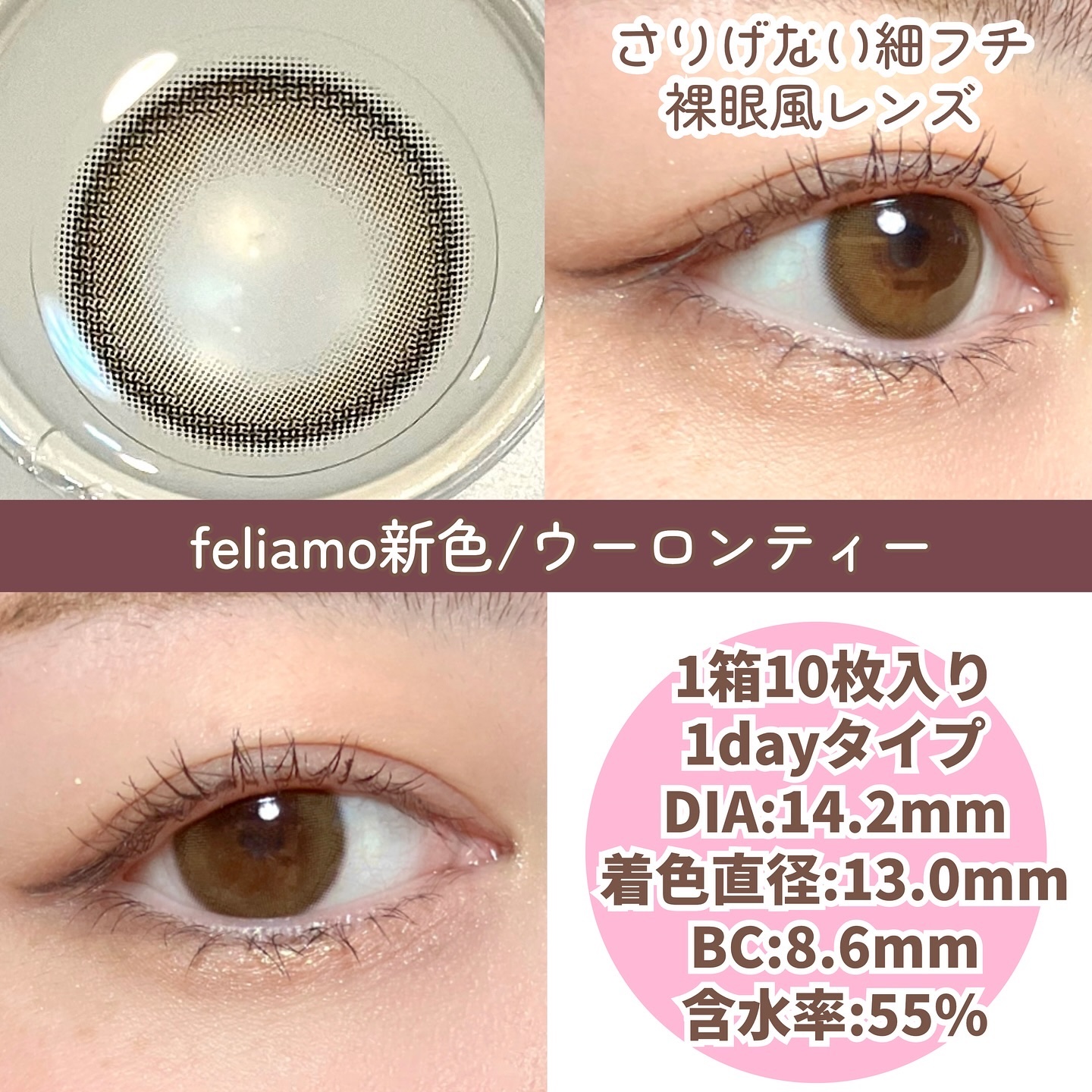 - ※2025年6月以降、商品パッケージ裏面・側面の一部表記を順次変更いたします。尚、これにかかる商品の交換・返品は承っておりません。 どんな瞬間にも溶け込む誰からも愛される瞳へ feliamoの由来は felice amore~幸せな愛~ 瞳から愛されオーラを放つ好印象レンズで女性らしさと品を演出。 オンも、オフも、特別な日も。 どんな場面にも溶け込むレンズラインナップで誰からも愛される瞳に。 UV CUT Feature1 肌や瞳に有害といわれ、白内障などの眼病を引き起こす危険性のある紫外線を99%カットします。(UV-A波75%、UV-B波99%カット) イオン性 Feature1 水分を多く含み酸素を通しやすいため瞳にやさしい使い心地で、快適な装用感です。 高含水 Feature1 水分が多く含むやわらかい素材で、快適なつけ心地です。 レンズ構造 Feature1 まぶた側に着色剤を内包しているため、角膜に色素が触れることがない構造を採用しています。 レンズ形状 Feature1 フチを丸みのある形状にすることで自然な装用感を実現しました。 ※装用感には個人差があります。 カラーコンタクトレンズの不適正使用による眼障害の危険性等などがあります。 ●コンタクトレンズは高度管理医療機器です。不十分な洗浄・消毒など不適切なケアや、長時間・交換期間を超えた装用により、アレルギー性結膜炎、角膜感染症、角膜潰瘍等の重篤な眼障害が発生する危険性があります ●ご使用前に取扱説明書を確認してください 使用上の留意事項 ●眼科医院等を受診してからお求めください ●眼に異常を感じたら直ちにレンズ使用を中止し、お近くの眼科等で診察を受けてください ●医師の指示にしたがってご使用ください ●コンタクトレンズを装用する場合、自覚症状がなくても、眼科医院等での定期検査を受けてください ●レンズに不具合がある場合は使用しないでください