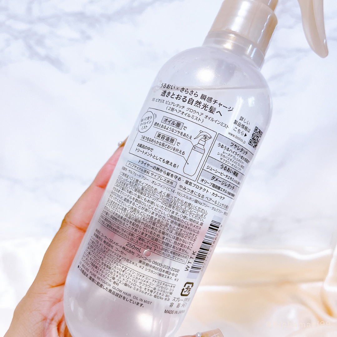 - 自然の力で美髪レタッチ*! 振って使う2層タイプで透きとおる自然光髪へみちびく、インバス・アウトバスどちらでも使えるオイルインミスト。 使うたびやみつきになるペアー&ミュゲの香り。 *ツヤのある髪に仕上がること