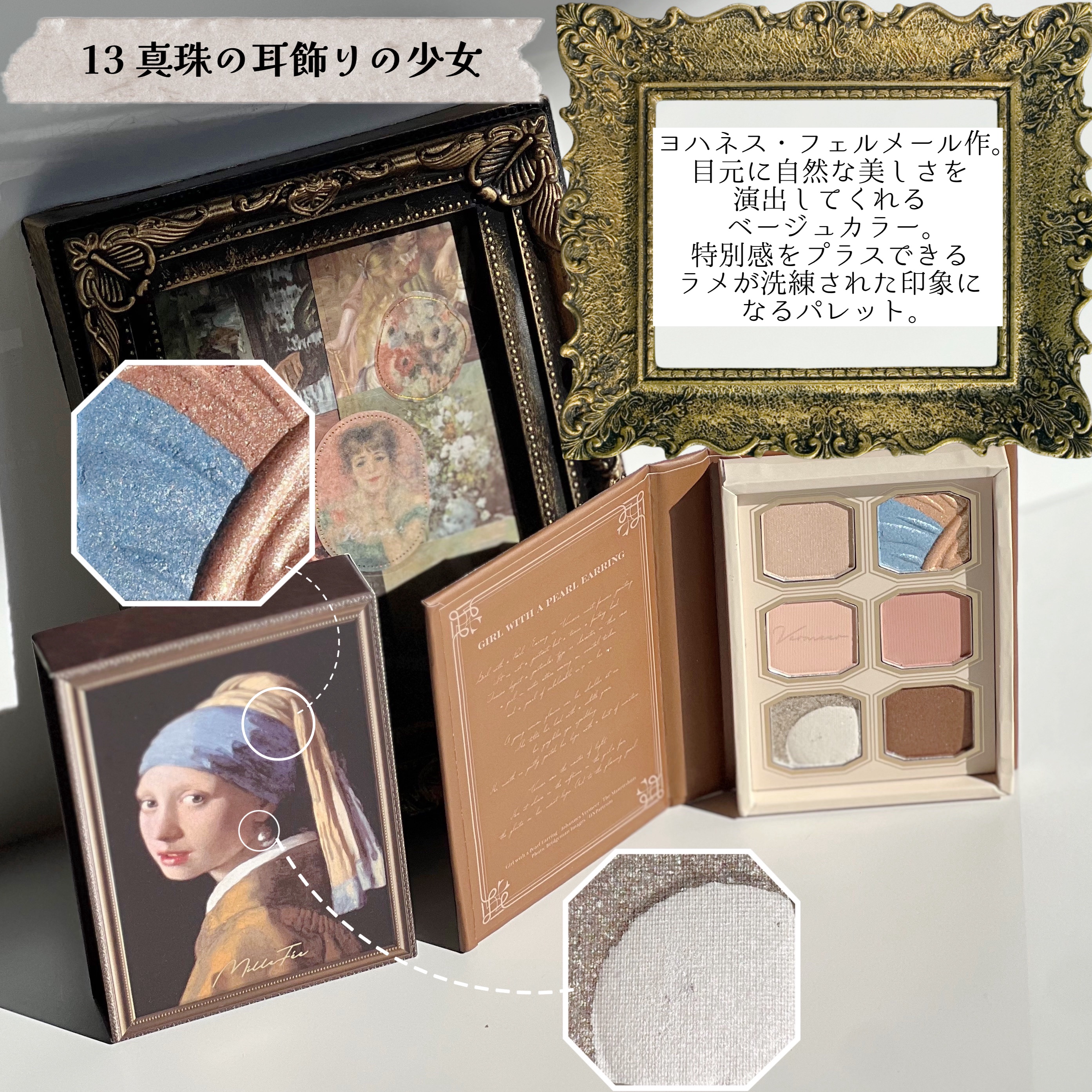 柔らかい色味と真珠やドレープのデザインが印象的なパレット。 絵画の世界観が忠実に表現されてて眼福🥹 特に左上のパール見てほしい!この光り方、まさに真珠じゃない!?💫 使いやすいかつオシャレなパレット。 絵画アイシャドウパレットはカラバリも豊富なのでお気に入りの色味が見つかるはず!