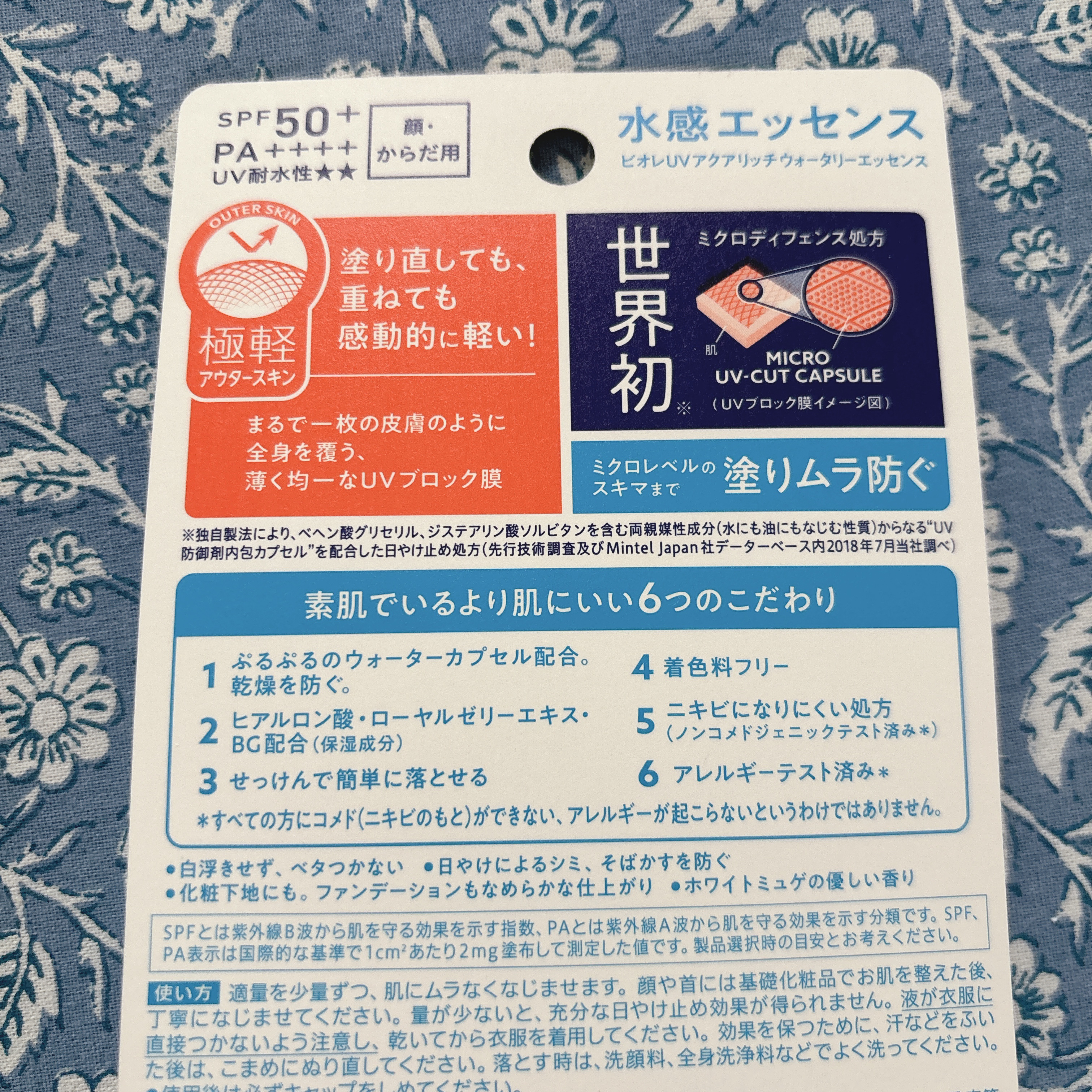 - 塗り直しても、重ねても感動的に軽い!水感UV。ミクロレベルのスキマまで塗りムラ防ぐ。化粧下地にも。ファンデーションもなめらかな仕上がり。日やけによるシミ、そばかすを防ぐ。スーパーウォータープルーフ(80分間の耐水試験で確認済み)。せっけんで落とせる。顔・からだ用。SPF50+/PA++++。白浮きしにくく、ベタつきにくい。ヒアルロン酸・ローヤルゼリーエキス・BG配合(保湿成分)