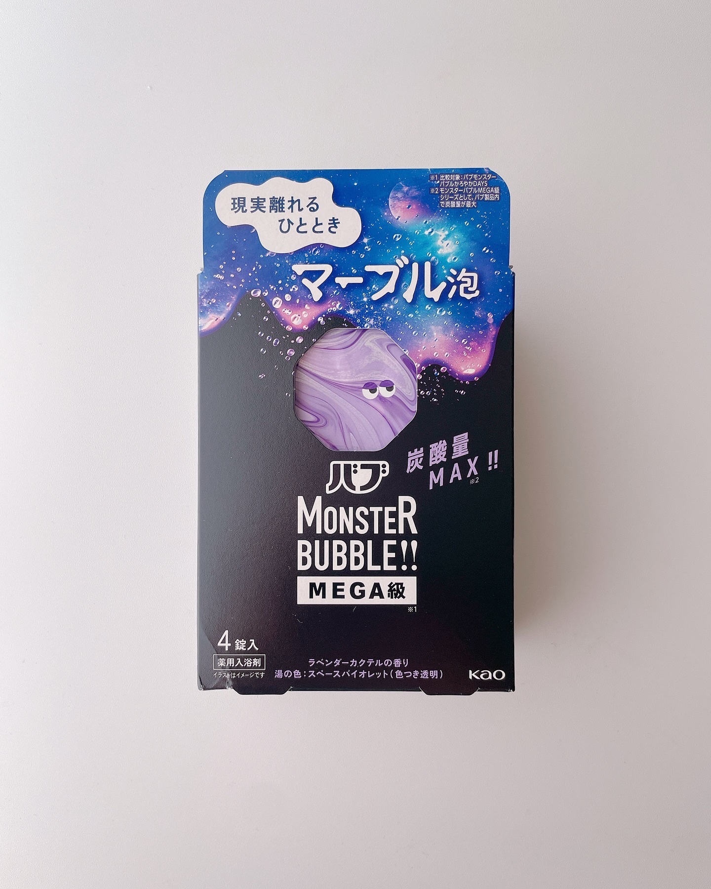 - 【医薬部外品】 この発散*1入浴、きっとクセになる。 外の現実から離れて、どっぷりオフロを楽しもう! とろけてゆらめくマーブル泡。 ●MEGAタブレット*2 ●炭酸量MAX*3 ●温浴効果を高め、疲労回復 ●ラベンダーカクテルの香り *1炭酸泡がはじけること *2比較対象:当社バブモンスターバブルかろやかDAYS *3モンスターバブルMEGA級シリーズとして、バブ製品内で炭酸量が最大 湯の色:スペースバイオレット(色つき透明) ラベンダーカクテルの香り