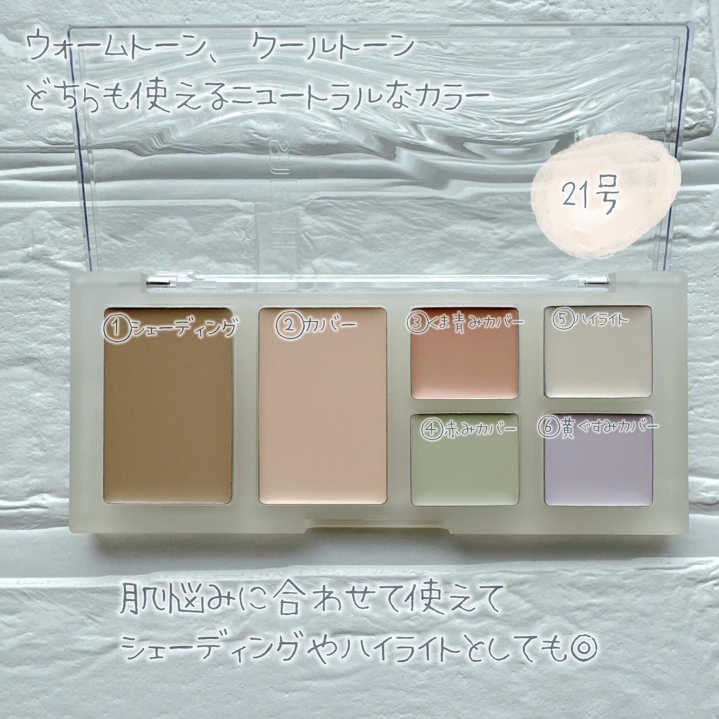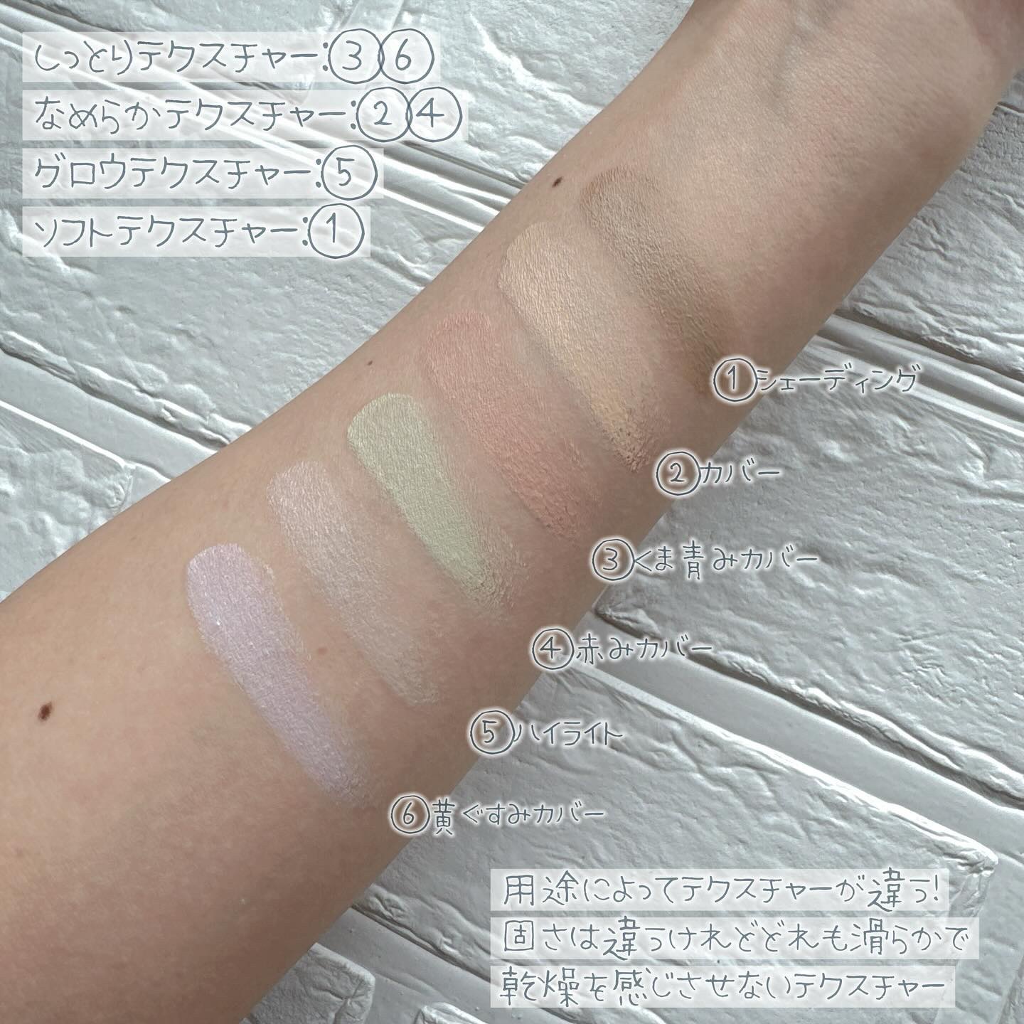 - 6色のカラーが入った、コンシーラーパレットで、コンシーラーとしてだけでなく、シェーディング、ハイライト、トーン調整が可能です。 ピーチ: クマカバーにおすすめ。保湿力が高く、ナチュラルなツヤ感です。 グリーン:ニキビや赤みのカバーにおすすめ。滑らかなテクスチャーで、カバー力が高いです。 パープル: くすみカバーにおすすめ。保湿力が高く、ナチュラルなツヤ感です。 ハイライト: 光の屈折を利用し、自然で柔らかい輝きを与えます。 シェーディング: 自然に影を演出し、しっかりと密着します。 コンシーラー: 滑らかなテクスチャーで、カバー力が高いです。