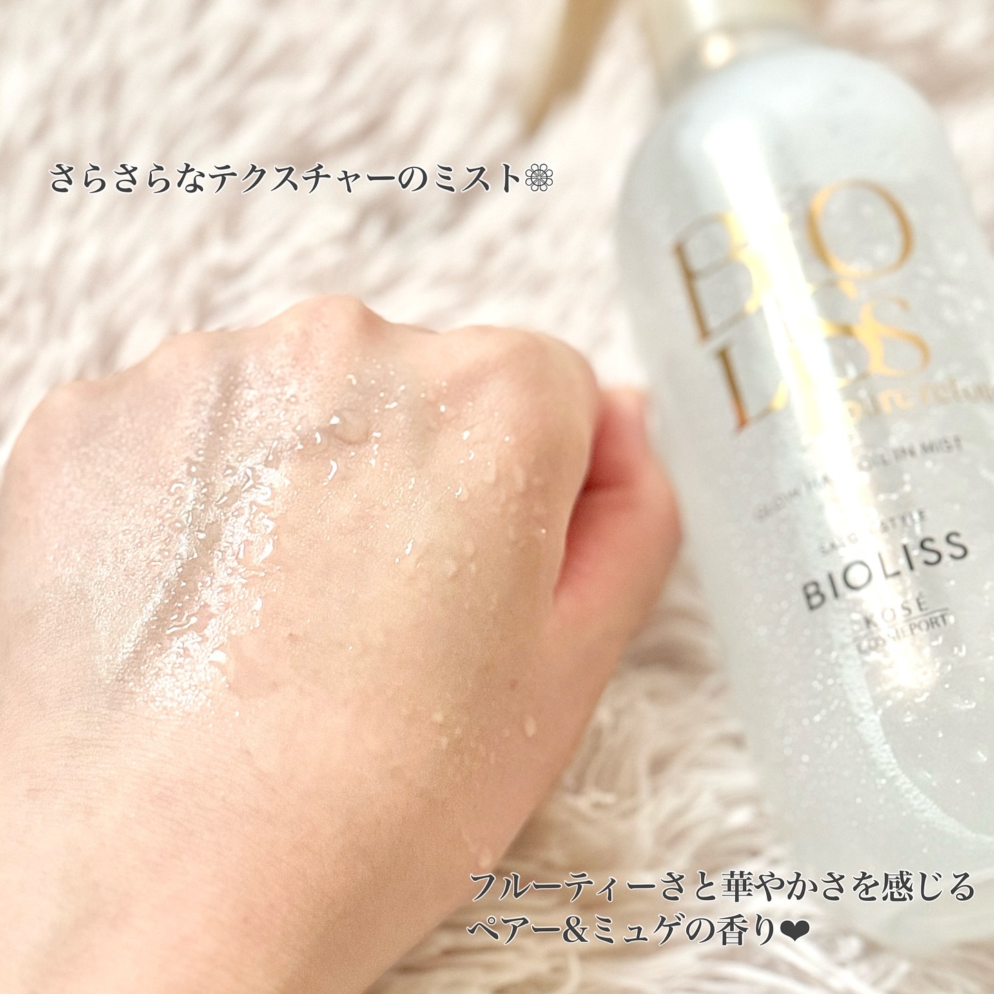 - 自然の力で美髪レタッチ*! 振って使う2層タイプで透きとおる自然光髪へみちびく、インバス・アウトバスどちらでも使えるオイルインミスト。 使うたびやみつきになるペアー&ミュゲの香り。 *ツヤのある髪に仕上がること