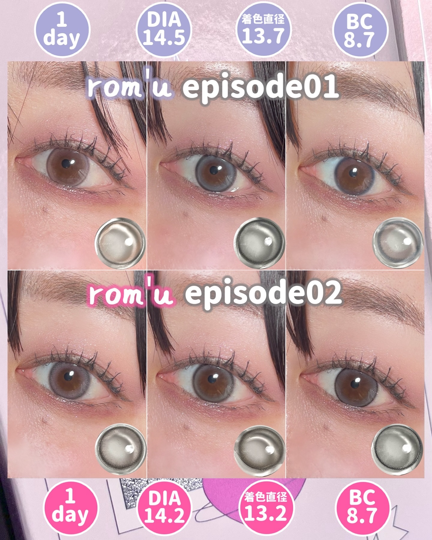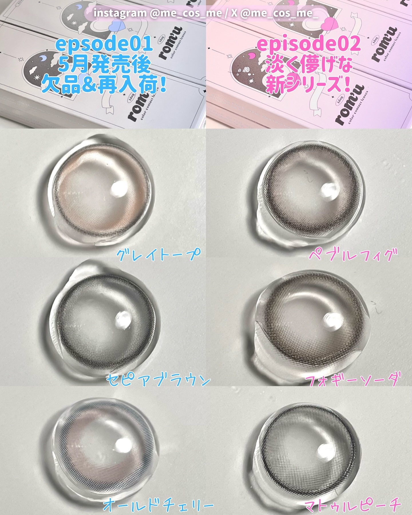 しっかり盛れる大きめのレンズ✨✨ 今回の投稿では欠品度数が続出した人気シリーズのrom’u episode01,02,03全カラー計9色をご紹介します🫧 太フチ×パープルカラーで甘さと存在感のある瞳へ💜 潤みピンク×ネイビーフチで自分の瞳の良さをいかす儚げレンズ🦋