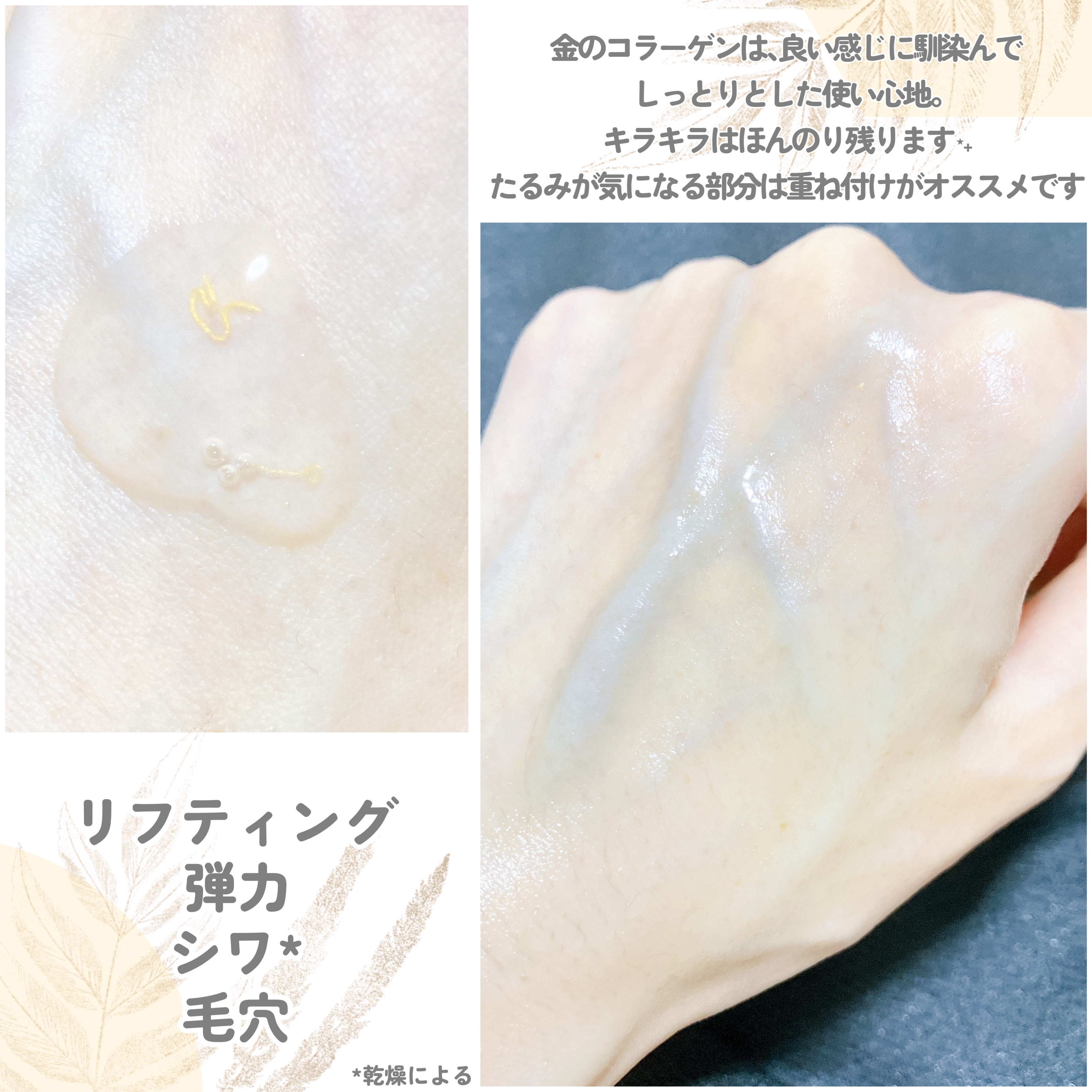 - <35mL> 水、BG、グリセリン、メチルプロパンジオール、1,2-ヘキサンジオール、ナイアシンアミド、カルボマー、トロメタン、PPG-13デシルテトラデセス-24、ヒドロキシエチルセルロース、シルクエキス、アデノシン、トチャカ、カンテン、エチルヘキシルグリセリン、EDTA-2Na、(アクリルレート/アクリル酸アルキル(C10-30))クロスポリマー、合成フルオトフロゴバイト、ベタイン、パンテノール、加水分解エラスチン、酸化チタン、赤色酸化鉄、マイカ、ジェランガム、加水分解コラーゲンエキス、ツボクサエキス、プロパンジオール、リン酸アスコルビルMg、ドクダミエキス、レシチン、アセチルグルタミン、フェノキシエタノール、カワラヨモギエキス、ヒアルロン酸Na、カプリリルグリコール、酸化スズ、金、スクワラン、水添ポリイソブテン、ベンジルグリコール、合成ヒト遺伝子組換オリゴペプチド-1、合成ヒト遺伝子組換ポリペプチド-1、合成ヒト遺伝子組換オリゴペプチド-2、合成ヒト遺伝子組換ポリペプチド-11、合成ヒト遺伝子組換オリゴペプチド-9、加水分解ムコ多糖、コラーゲン、トコフェロール、ヒアルロン酸クロスポリマーNa、加水分解ヒアルロン酸、合成ヒト遺伝子組換デカペプチド-7、合成ヒトオクタペプチド-4、合成ヒトペンタペプチド-19、ヒアルロン酸ヒドロキシプロピルトリモニウム、バルミトイルペンタペプチド-4、アセチルヘキサペプチド-8、トリペプチド-1、銅、ヒアルロン酸、ハナスゲ根エキス、アセチルヒアルロン酸Na、ラズベリーケトン