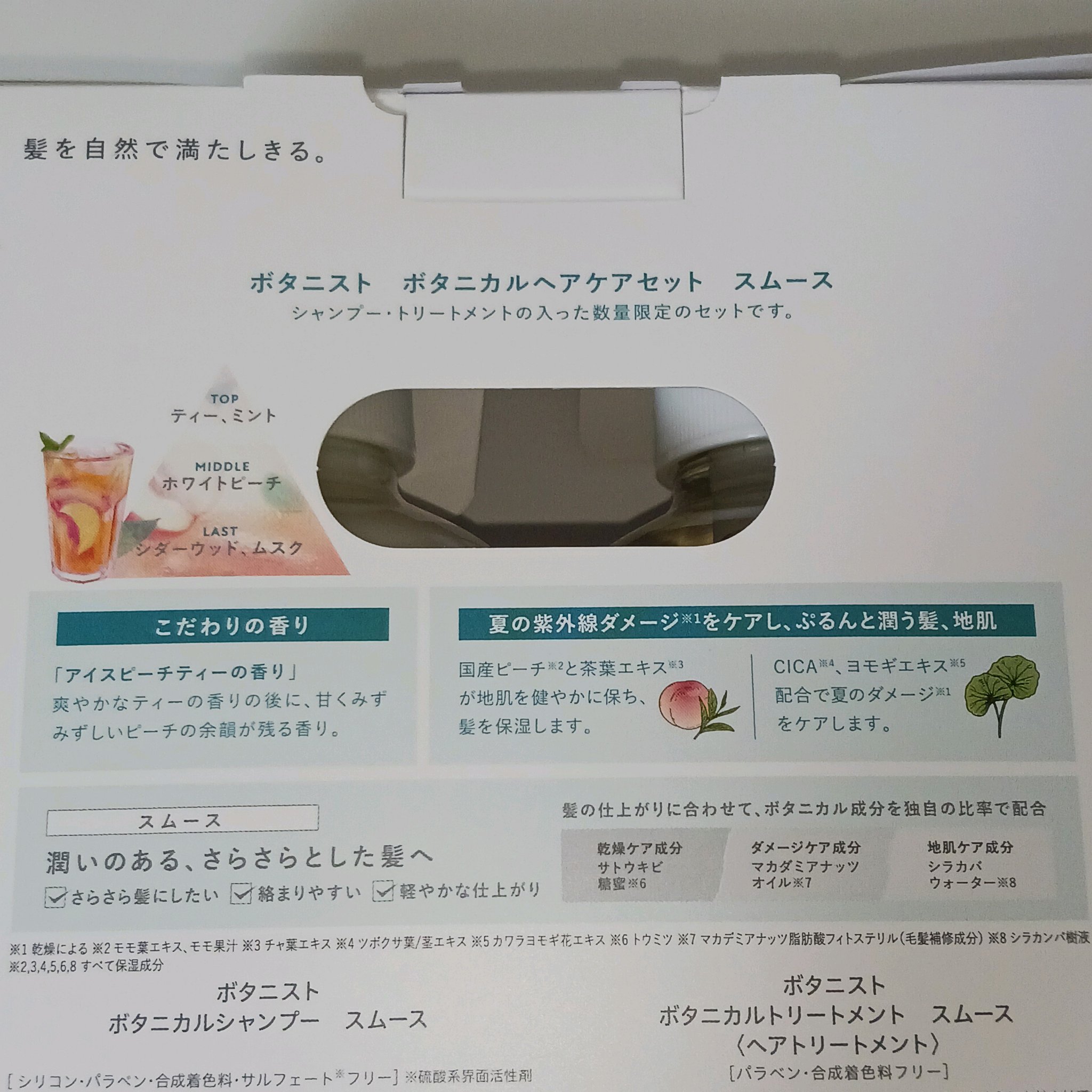 - 〈夏限定品〉スムース:さらさらとした、潤いのある髪へ 1.24年夏限定オリジナルの「ピーチ×ティー」のダブルフレグランス 甘くみずみずしいピーチの香りと、ティーの香りを掛け合わせた爽やかでフルーティなアイスピーチティーの香り。 甘すぎず落ち着きのある大人の香りで、爽やかな夏らしさを演出します。 2.サステナブルな原料である国産ピーチ*配合で 、髪と肌にうるおいを与え健やかに保つ 山梨県産の早摘みモモ、岡山県産のモモ葉を使用。白桃の生産過程において、間引き、廃棄されてしまう実と葉を活用したサステナブルな原料です。ピーチから抽出されるモモ果汁・モモ葉エキスの保湿効果により、うるおいを与え健やかな髪と肌へと導きます。 * モモ葉エキス、モモ果汁(すべて保湿成分) 3.夏の紫外線などによる乾燥ダメージから髪をケアする植物成分配合 紫外線などによる夏特有の乾燥をケアする植物成分 CICA(シカ)エキス*6・ヨモギエキス*7を配合。 CICAエキスはボタニストスタンダードラインの訴求成分としては今回が初の配合となります。 *6 ツボクサ葉/茎エキス(シャンプー・トリートメント・泡ボディーソープ・ヘアミルク)、ツボクサエキス(液体ボディーソープ、ヘアオイル) (すべて保湿成分) *7 カワラヨモギ花エキス(シャンプー・トリートメント)、ヨモギ葉エキス(泡ボディーソープ・液体ボディーソープ・ヘアミルク・ヘアオイル)(すべて保湿成分) 4.暑い夏にぴったりなやさしい冷涼感 ミントエキス*8とメントール*9配合*10で、暑い夏を乗り切るやさしい冷涼感を演出しています。また、フォーミングボディーソープはさらにマイルドな冷涼感に調整をしています。 *8 セイヨウハッカ葉エキス(保湿成分) *9 清涼成分 *10 ご使用中、クール感を感じます。メントールの冷感刺激に弱い方はご使用をお控えください。トリートメント、ヘアミルク、ヘアオイルにはメントールは配合していません。 ※オンラインストアのみ販売 セットのみ ※全国のドラッグストア、バラエティショップにて販売(一部店舗を除く)