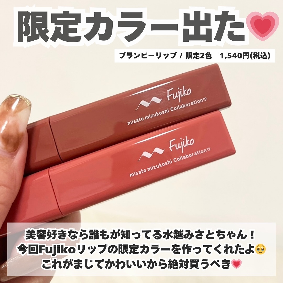 フジコの大人気ティントリップをご紹介。重ねるほどにパーンと膨らむ*プランプティント。*メイクアップ効果による ティント×プランパーの豪華ダブル処方でカラーも楽しみつつ、縦じわの気になりにくいぷるんとした唇に❤️ 水越みさとちゃんコラボ限定カラーはPLAZA アトレ恵比寿店・梅田ヘップファイブ店にて先行発売中。全国発売は2024年8月26日(月)から!