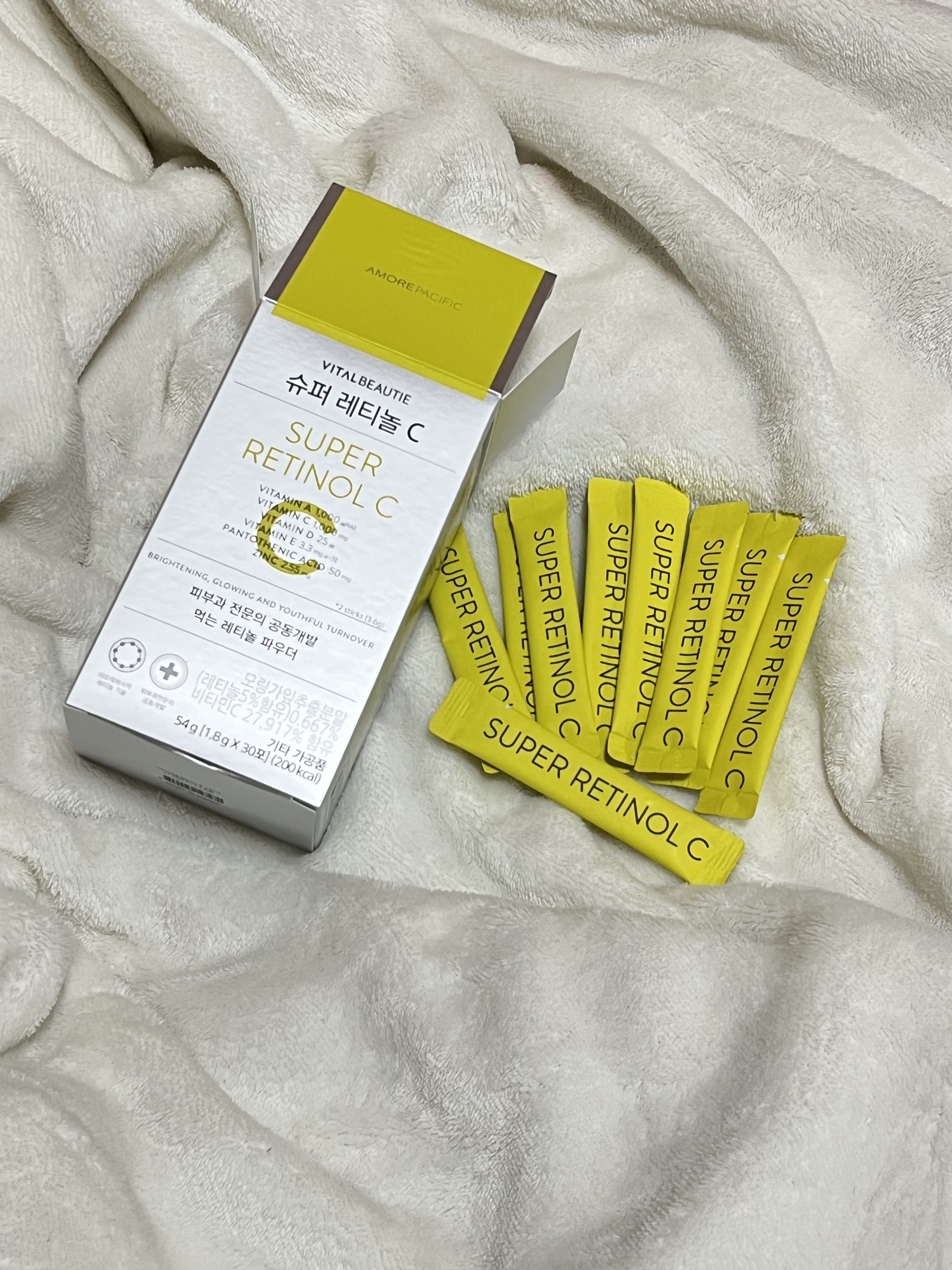 - 食べるタイプのレチノール 1) 専門家のフォーミュラ Flex! - 皮膚科専門医とアモーレパシフィックが共同開発 29年間蓄積したレチノール技術で完成! 食べるレチノールプロテクション技術を適用 (ビタミンA、1000ugRAE配合*) 2) 明るく輝く! - 豊富に含むビタミンC1,000mg含有* - パントテン酸1日栄養成分基準配合* - ビタミンE、ビタミンD、亜鉛 副成分 L-システインとヘスペリジンを配合 3) さわやかなシトラスの味 「ヴィーガンレチノール」 - ヴィーガン認証を取得した毎日摂取できる美味しいレチノール *上記の栄養成分の数値は、2包摂を基準に作成された含量です *お召し上がり方! 1回1~2包を 直接摂取してください