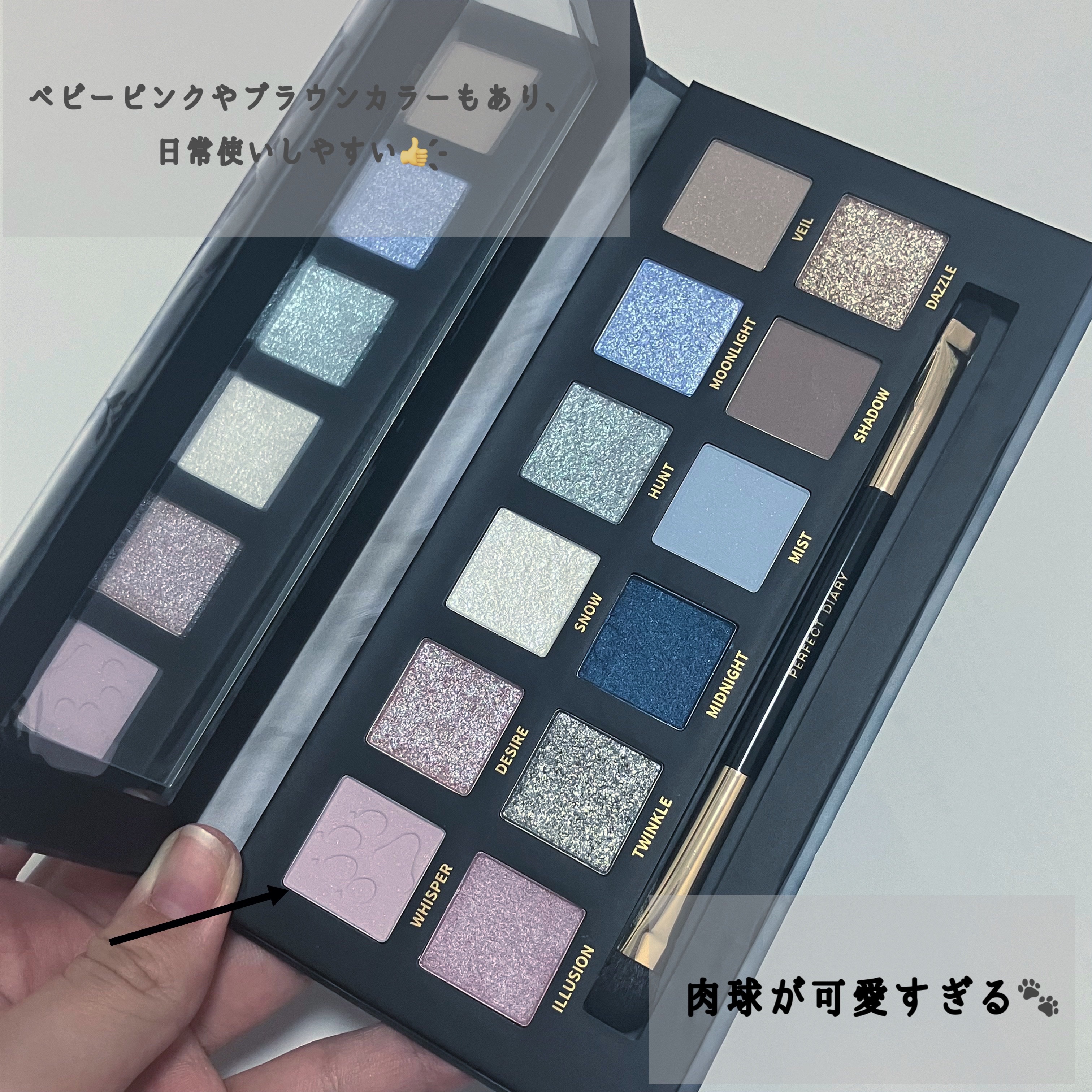 動物モチーフのアイシャドウパレットが大人気! パーフェクトダイアリーの日本限定色NEWオオカミパレットで、ちょっぴり派手めクールな冬メイクしてみたよ❄️❄️ 寒さが厳しい雪原に棲むオオカミの神秘的かつ力強い姿からインスパイアされたパレット。雪原の氷と雪をイメージしたカラーに日常メイクにもぴったりなベビーピンクとブラウンなどを組み合わせて、クールな印象のスモーキーメイクや透明感あふれるメイクまでもこれ1つで叶える! 推しポイントは“ラメ感”☝️!! どれもめっっっちゃ綺麗💎✨ さすが中華コスメ🇨🇳!!さすがパーフェクトダイアリー👏!!チラチラ輝く青ラメが最高に美しいからぜひ見てみて欲しい…🥺✨